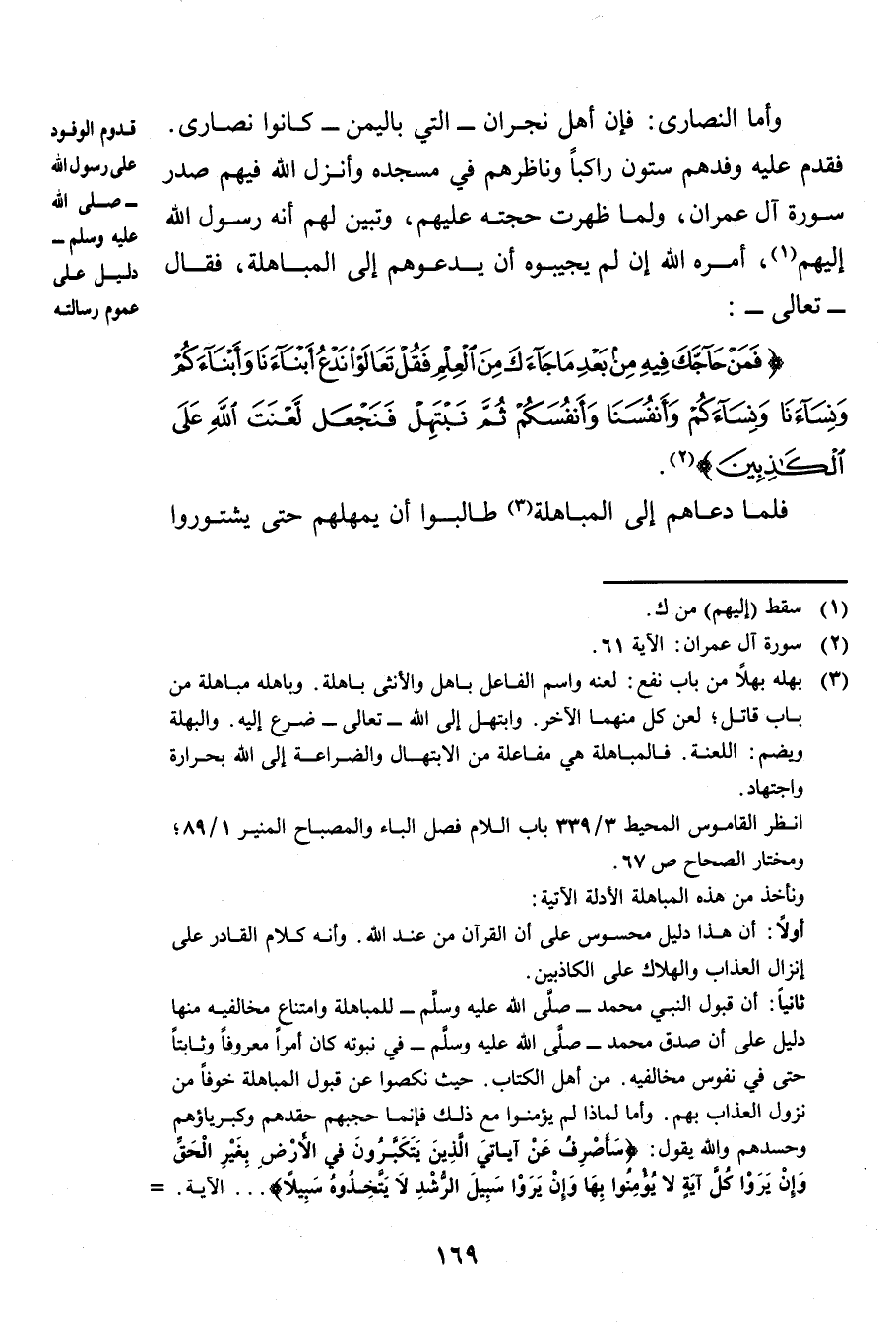 وَأَمَّا النَّصَارَى فَإِنَّ أَهْلَ نَجْرَانَ الَّتِي بِالْيَمَنِ كَانُوا نَصَارَى، فَقَدِمَ عَلَيْهِ وَفْدُهُمْ سِتُّونَ رَاكِبًا وَنَاظَرَهُمْ فِي مَسْجِدِهِ، وَأَنْزَلَ اللَّهُ فِيهِمْ صَدْرَ سُورَةِ آلِ عِمْرَانَ، وَلَمَّا ظَهَرَتْ حُجَّتُهُ عَلَيْهِمْ، وَتَبَيَّنَ لَهُمْ أَنَّهُ رَسُولُ اللَّهِ إِلَيْهِمْ، أَمَرَهُ اللَّهُ إِنْ لَمْ يُجِيبُوهُ أَنْ يَدْعُوَهُمْ إِلَى الْمُبَاهَلَةِ فَقَالَ تَعَالَى: {فَمَنْ حَاجَّكَ فِيهِ مِنْ بَعْدِ مَا جَاءَكَ مِنَ الْعِلْمِ فَقُلْ تَعَالَوْا نَدْعُ أَبْنَاءَنَا وَأَبْنَاءَكُمْ وَنِسَاءَنَا وَنِسَاءَكُمْ وَأَنْفُسَنَا وَأَنْفُسَكُمْ ثُمَّ نَبْتَهِلْ فَنَجْعَلْ لَعْنَةَ اللَّهِ عَلَى الْكَاذِبِينَ} [آل عمران: 61] .