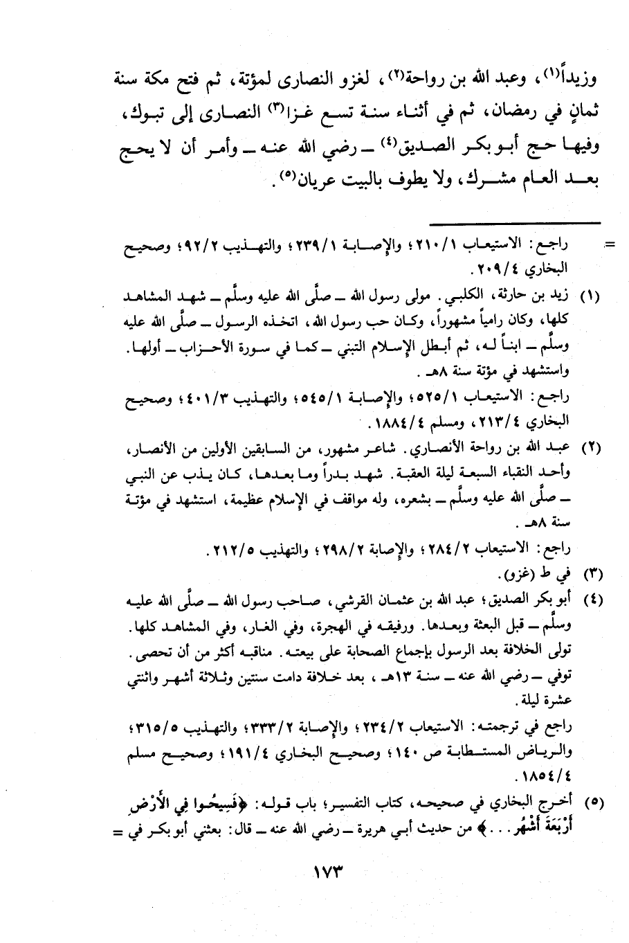 وَزَيْدًا وَعَبْدَ اللَّهِ بْنَ رَوَاحَةَ لِغَزْوِ النَّصَارَى لِمُؤْتَةَ، ثُمَّ فَتَحَ مَكَّةَ سَنَةَ ثَمَانٍ فِي رَمَضَانَ، ثُمَّ فِي أَثْنَاءِ سَنَةِ تِسْعٍ غَزَا النَّصَارَى إِلَى تَبُوكَ، وَفِيهَا حَجَّ أَبُو بَكْرٍ الصِّدِّيقُ رَضِيَ اللَّهُ عَنْهُ، وَأَمَرَ أَنْ لَا يَحُجَّ بَعْدَ الْعَامِ مُشْرِكٌ، وَلَا يَطُوفَ بِالْبَيْتِ عُرْيَانٌ.