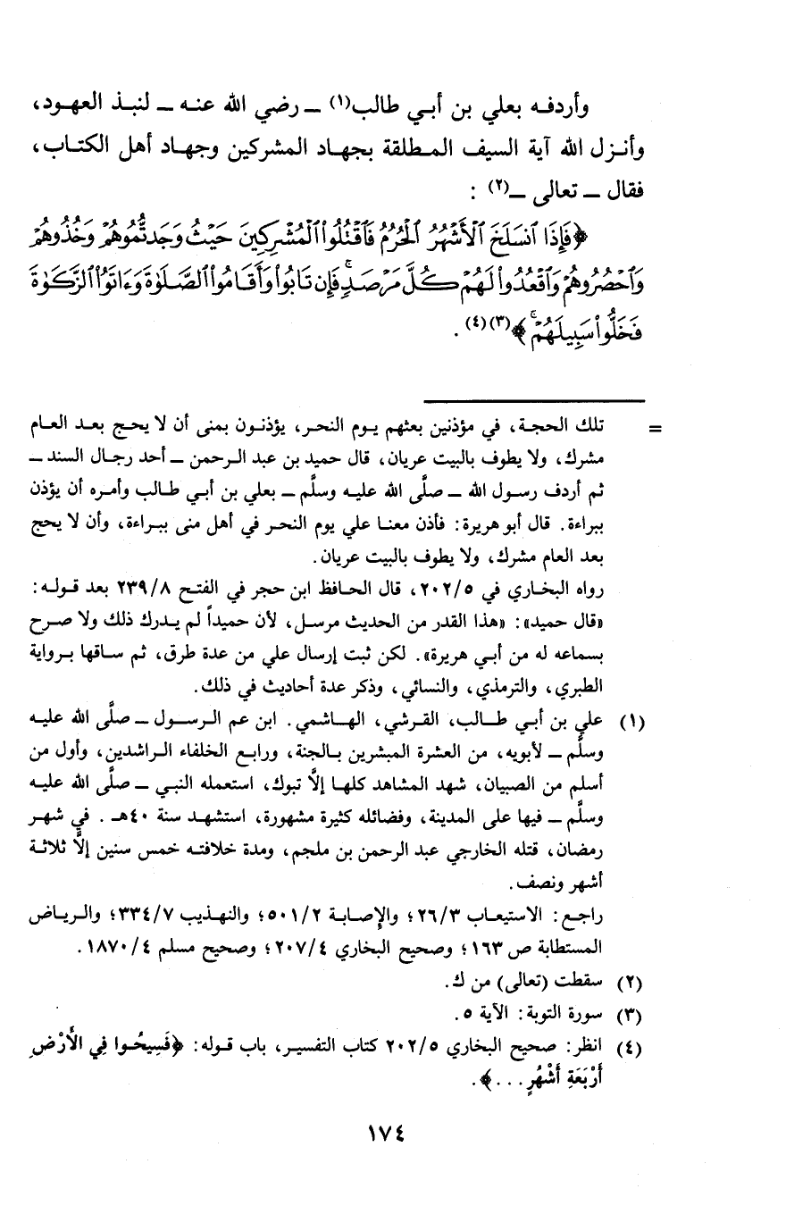 وَأَرْدَفَهُ بِعَلِيِّ بْنِ أَبِي طَالِبٍ رَضِيَ اللَّهُ عَنْهُ لِنَبْذِ الْعُهُودِ، وَأَنْزَلَ اللَّهُ آيَةَ السَّيْفِ الْمُطْلَقَةَ بِجِهَادِ الْمُشْرِكِينَ وَجِهَادِ أَهْلِ الْكِتَابِ، فَقَالَ تَعَالَى: {فَإِذَا انْسَلَخَ الْأَشْهُرُ الْحُرُمُ فَاقْتُلُوا الْمُشْرِكِينَ حَيْثُ وَجَدْتُمُوهُمْ وَخُذُوهُمْ وَاحْصُرُوهُمْ وَاقْعُدُوا لَهُمْ كُلَّ مَرْصَدٍ فَإِنْ تَابُوا وَأَقَامُوا الصَّلَاةَ وَآتَوُا الزَّكَاةَ فَخَلُّوا سَبِيلَهُمْ} [التوبة: 5] .