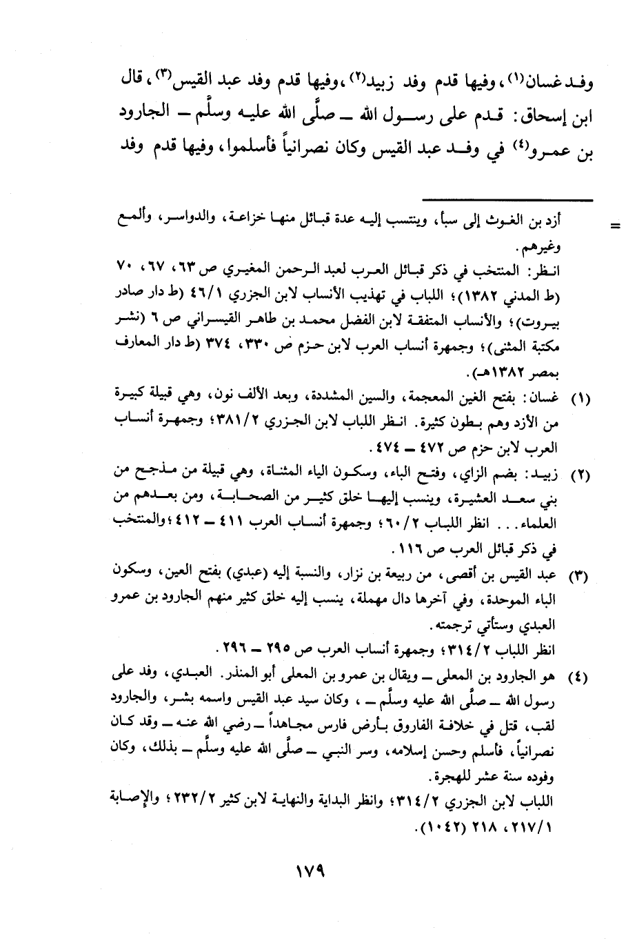 وَفْدُ غَسَّانَ وَفِيهَا قَدِمَ وَفْدُ زُبَيْدٍ، وَفِيهَا قَدِمَ وَفْدُ عَبْدِ الْقَيْسِ، قَالَ ابْنُ إِسْحَاقَ: قَدِمَ عَلَى رَسُولِ اللَّهِ صَلَّى اللَّهُ عَلَيْهِ وَسَلَّمَ الْجَارُودُ بْنُ عَمْرٍو فِي وَفْدِ عَبْدِ الْقَيْسِ، وَكَانَ نَصْرَانِيًّا فَأَسْلَمُوا، وَفِيهَا قَدِمَ وَفْدُ