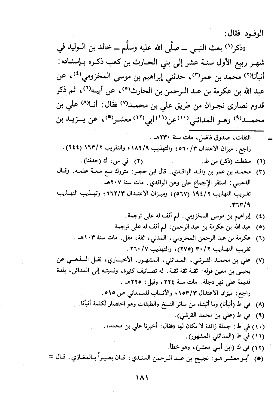 الْوُفُودِ فَقَالَ: ذِكْرُ بَعْثِ النَّبِيِّ صَلَّى اللَّهُ عَلَيْهِ وَسَلَّمَ خَالِدَ بْنَ الْوَلِيدِ فِي شَهْرِ رَبِيعٍ الْأَوَّلِ سَنَةَ عَشْرٍ إِلَى بَنِي الْحَارِثِ بْنِ كَعْبٍ ذَكَرَهُ بِإِسْنَادِهِ، أَنْبَأَنَا مُحَمَّدُ بْنُ عُمَرَ، حَدَّثَنِي إِبْرَاهِيمُ بْنُ مُوسَى الْمَخْزُومِيُّ، عَنْ عَبْدِ اللَّهِ بْنِ عِكْرِمَةَ بْنِ عَبْدِ الرَّحْمَنِ بْنِ الْحَارِثِ، عَنْ أَبِيهِ، ثُمَّ ذَكَرَ قُدُومَ نَصَارَى نَجْرَانَ مِنْ طَرِيقِ عَلِيِّ بْنِ مُحَمَّدٍ، فَقَالَ: أَنَا عَلِيُّ بْنُ مُحَمَّدٍ وَهُوَ الْمَدَائِنِيُّ، عَنْ أَبِي مَعْشَرٍ، عَنْ يَزِيدَ بْنِ