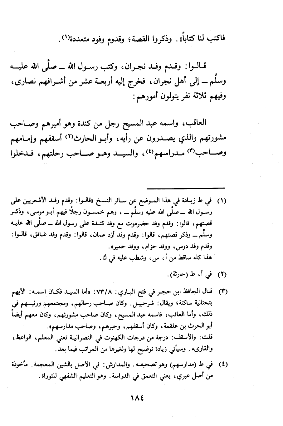 قَالُوا: وَقَدِمَ وَفْدُ نَجْرَانَ وَكَتَبَ رَسُولُ اللَّهِ صَلَّى اللَّهُ عَلَيْهِ وَسَلَّمَ إِلَى أَهْلِ نَجْرَانَ، فَخَرَجَ إِلَيْهِ أَرْبَعَةَ عَشَرَ مِنْ أَشْرَافِهِمْ نَصَارَى وَفِيهِمْ ثَلَاثَةُ نَفَرٍ يَتَوَلَّوْنَ أُمُورَهُمْ: الْعَاقِبُ، وَاسْمُهُ عَبْدُ الْمَسِيحِ رَجُلٌ مِنْ كِنْدَةَ وَهُوَ أَمِيرُهُمْ وَصَاحِبُ مَشُورَتِهِمْ وَالَّذِي يَصْدُرُونَ عَنْ رَأْيِهِ، وَأَبُو الْحَارِثِ أُسْقُفُّهُمْ وَإِمَامُهُمْ، وَصَاحِبُ مَدْرَاسِهِمْ، وَالسَّيِّدُ وَهُوَ صَاحِبُ رِحْلَتِهِمْ فَدَخَلُوا