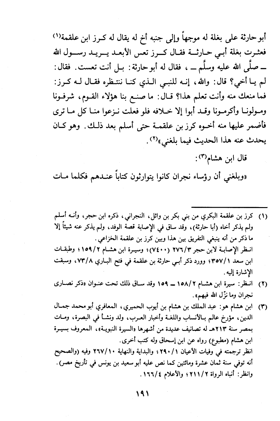 أَبُو حَارِثَةَ عَلَى بَغْلَةٍ لَهُ مُوَجِّهًا وَإِلَى جَنْبِهِ أَخٌ لَهُ يُقَالُ لَهُ كُرْزُ بْنُ عَلْقَمَةَ، فَعَثَرَتْ بَغْلَةُ أَبِي حَارِثَةَ، فَقَالَ كُرْزٌ: تَعِسَ الْأَبْعَدُ، يُرِيدُ رَسُولَ اللَّهِ صَلَّى اللَّهُ عَلَيْهِ وَسَلَّمَ، فَقَالَ لَهُ أَبُو حَارِثَةَ: بَلْ أَنْتَ تَعِسْتَ، فَقَالَ، لِمَ يَا أَخِي؟ قَالَ وَاللَّهِ إِنَّهُ لَلنَّبِيُّ الَّذِي كُنَّا نَنْتَظِرُهُ، فَقَالَ لَهُ كُرْزٌ: فَمَا مَنْعَكَ مِنْهُ وَأَنْتَ تَعْلَمُ هَذَا؟ قَالَ: مَا صَنَعَ بِنَا هَؤُلَاءِ الْقَوْمُ شَرَّفُونَا، وَمَوَّلُونَا، وَأَكْرَمُونَا، وَقَدْ أَبَوْا إِلَّا خِلَافَهُ، فَلَوْ فَعَلْتُ نَزَعُوا مِنَّا كُلَّ مَا تَرَى فَأَضْمَرَ عَلَيْهَا مِنْهُ أَخُوهُ كُرْزُ بْنُ عَلْقَمَةَ حَتَّى أَسْلَمَ بَعْدَ ذَلِكَ وَهُوَ كَانَ يُحَدِّثُ عَنْهُ هَذَا الْحَدِيثَ فِيمَا بَلَغَنِي.