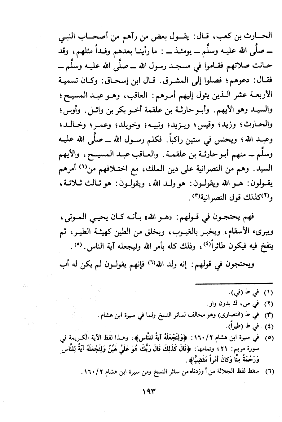 الْحَارِثِ بْنِ كَعْبٍ، قَالَ: يَقُولُ بَعْضُ مَنْ رَآهُمْ مِنْ أَصْحَابِ النَّبِيِّ صَلَّى اللَّهُ عَلَيْهِ وَسَلَّمَ يَوْمَئِذٍ: مَا رَأَيْنَا بَعْدَهُمْ وَفْدًا مِثْلَهُمْ، وَقَدْ حَانَتْ صَلَاتُهُمْ، فَقَامُوا فِي مَسْجِدِ رَسُولِ اللَّهِ صَلَّى اللَّهُ عَلَيْهِ وَسَلَّمَ فَقَالَ: دَعُوهُمْ، فَصَلَّوْا إِلَى الْمَشْرِقِ. قَالَ ابْنُ إِسْحَاقَ: وَكَانَ تَسْمِيَةُ الْأَرْبَعَةَ عَشَرَ الَّذِينَ يَئُولُ إِلَيْهِمْ أَمْرُهُمْ: الْعَاقِبُ وَهُوَ عَبْدُ الْمَسِيحِ، وَالسَّيِّدُ وَهُوَ الْأَيْهَمُ، وَأَبُو حَارِثَةَ بْنُ عَلْقَمَةَ أَخُو بَكْرِ بْنِ وَائِلٍ، وَأَوْسٌ، وَالْحَارِثُ، وَزَيْدٌ، وَقَيْسٌ، وَيَزِيدُ، وَنُبَيْهٌ، وَخُوَيْلِدٌ، وَعُمَرُ، وَخَالِدٌ، وَعَبْدُ اللَّهِ، وَيُحَنَّسُ فِي سِتِّينَ رَاكِبًا، فَكَلَّمَ رَسُولَ اللَّهِ صَلَّى اللَّهُ عَلَيْهِ وَسَلَّمَ مِنْهُمْ أَبُو حَارِثَةَ بْنُ عَلْقَمَةَ، وَالْعَاقِبُ عَبْدُ الْمَسِيحِ، وَالْأَيْهَمُ السَّيِّدُ، وَهُمْ مِنَ النَّصْرَانِيَّةِ عَلَى دِينِ الْمَلِكِ مَعَ اخْتِلَافِهِمْ مِنْ أَمْرِهِمْ يَقُولُونَ هُوَ اللَّهُ، وَيَقُولُونَ هُوَ وَلَدُ اللَّهِ، وَيَقُولُونَ هُوَ ثَالِثُ ثَلَاثَةٍ، وَكَذَلِكَ قَوْلُ النَّصْرَانِيَّةِ.