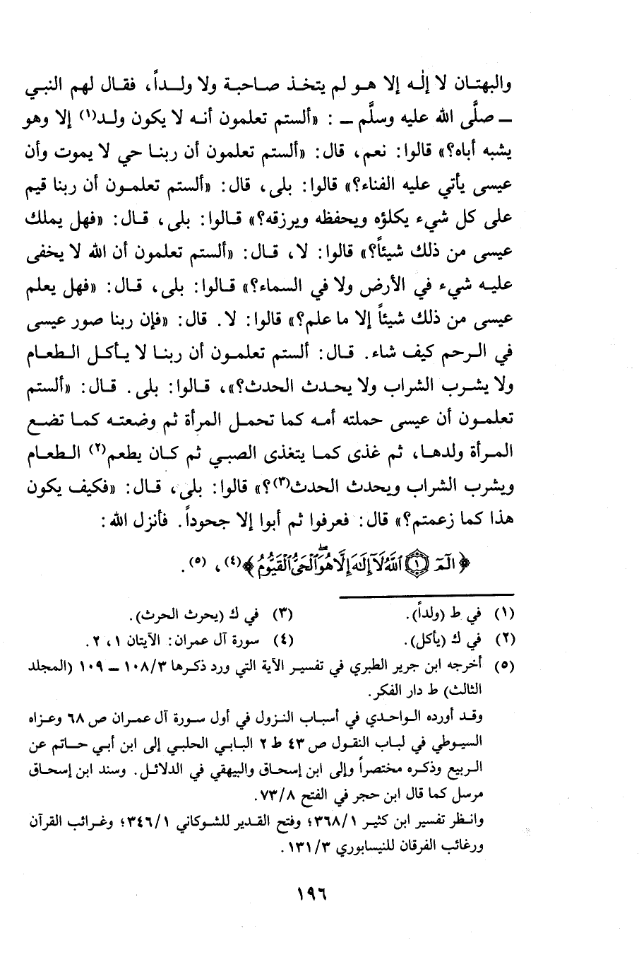وَالْبُهْتَانَ - لَا إِلَهَ إِلَّا هُوَ لَمْ يَتَّخِذْ صَاحِبَةً وَلَا وَلَدًا، فَقَالَ لَهُمُ النَّبِيُّ صَلَّى اللَّهُ عَلَيْهِ وَسَلَّمَ: أَلَسْتُمْ تَعْلَمُونَ أَنَّهُ لَا يَكُونُ وَلَدٌ إِلَّا وَهُوَ يُشْبِهُ أَبَاهُ؟ ، قَالُوا: نَعَمْ. قَالَ: أَلَسْتُمْ تَعْلَمُونَ أَنَّ رَبَّنَا حَيٌّ لَا يَمُوتُ وَأَنَّ عِيسَى يَأْتِي عَلَيْهِ الْفَنَاءُ؟ ، قَالُوا: بَلَى. قَالَ: أَلَسْتُمْ تَعْلَمُونَ أَنَّ رَبَّنَا قَيِّمٌّ عَلَى كُلِّ شَيْءٍ يَكْلَؤُهُ وَيَحْفَظُهُ وَيَرْزُقُهُ؟ ، قَالُوا: بَلَى. قَالَ: فَهَلْ يَمْلِكُ عِيسَى مِنْ ذَلِكَ شَيْئًا؟ قَالُوا: لَا. قَالَ: أَلَسْتُمْ تَعْلَمُونَ أَنَّ اللَّهَ لَا يَخْفَى عَلَيْهِ شَيْءٌ فِي الْأَرْضِ وَلَا فِي السَّمَاءِ؟ ، قَالُوا: بَلَى. قَالَ: فَهَلْ يَعْلَمُ عِيسَى مِنْ ذَلِكَ شَيْئًا إِلَّا مَا عُلِّمَ؟ ، قَالُوا: لَا. قَالَ: فَإِنَّ رَبَّنَا صَوَّرَ عِيسَى فِي الرَّحِمِ كَيْفَ شَاءَ قَالَ: أَلَسْتُمْ تَعْلَمُونَ أَنَّ رَبَّنَا لَا يَأْكُلُ الطَّعَامَ وَلَا يَشْرَبُ الشَّرَابَ وَلَا يُحْدِثُ الْحَدَثَ؟ ، قَالُوا: بَلَى. قَالَ: أَلَسْتُمْ تَعْلَمُونَ أَنَّ عِيسَى حَمَلَتْهُ أُمُّهُ كَمَا تَحْمِلُ الْمَرْأَةُ، ثُمَّ وَضَعَتْهُ كَمَا تَضَعُ الْمَرْأَةُ وَلَدَهَا، ثُمَّ غُذِّيَ كَمَا يَتَغَذَّى الصَّبِيُّ، ثُمَّ كَانَ يَطْعَمُ الطَّعَامَ وَيَشْرَبُ الشَّرَابَ وَيُحْدِثُ الْحَدَثَ؟ ، قَالُوا: بَلَى. قَالَ: فَكَيْفَ يَكُونُ هَذَا كَمَا زَعَمْتُمْ؟ . قَالَ: فَعَرَفُوا ثُمَّ أَبَوْا إِلَّا الْجُحُودَ فَأَنْزَلَ اللَّهُ {الم - اللَّهُ لَا إِلَهَ إِلَّا هُوَ الْحَيُّ الْقَيُّومُ} [آل عمران: 1 - 2] » .