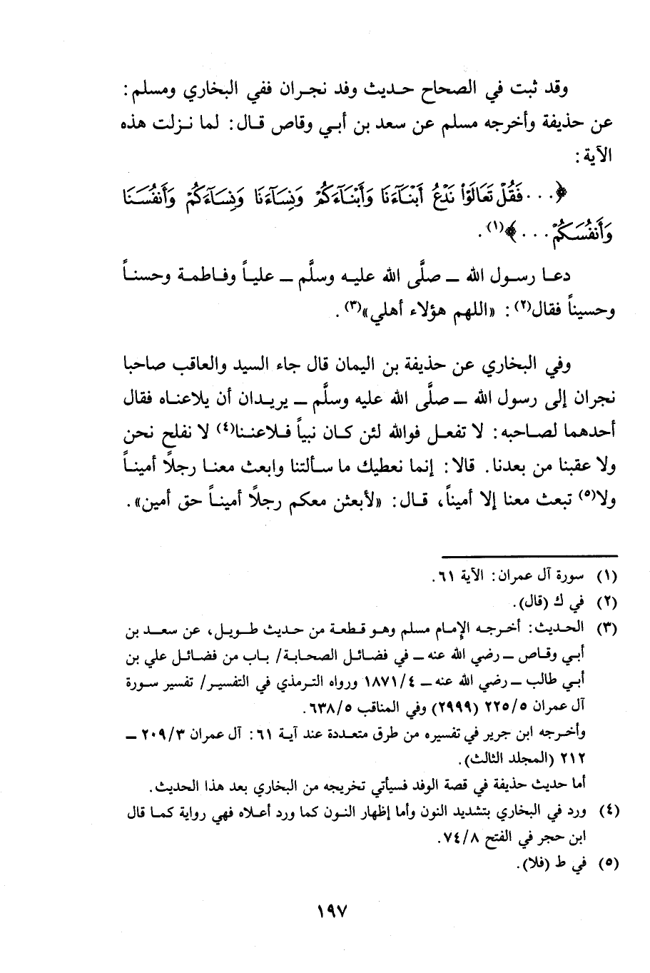 وَقَدْ ثَبَتَ فِي الصِّحَاحِ حَدِيثُ وَفْدِ نَجْرَانَ فَفِي الْبُخَارِيِّ وَمُسْلِمٍ عَنْ حُذَيْفَةَ، وَأَخْرَجَهُ مُسْلِمٌ عَنْ سَعْدِ بْنِ أَبِي وَقَّاصٍ قَالَ: لَمَّا نَزَلَتْ هَذِهِ الْآيَةُ: {فَقُلْ تَعَالَوْا نَدْعُ أَبْنَاءَنَا وَأَبْنَاءَكُمْ وَنِسَاءَنَا وَنِسَاءَكُمْ وَأَنْفُسَنَا وَأَنْفُسَكُمْ} [آل عمران: 61] .