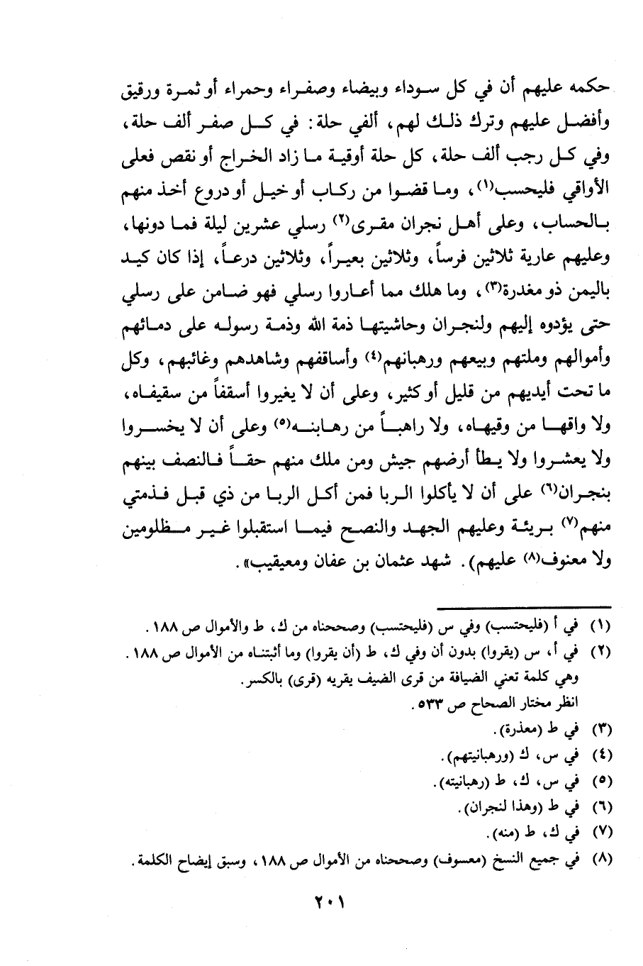 حُكْمُهُ عَلَيْهِمْ أَنَّ فِي كُلِّ سَوْدَاءَ وَبَيْضَاءَ وَصَفْرَاءَ وَحَمْرَاءَ أَوْ ثَمَرَةٍ وَرَقِيقٍ وَأُفْضِلَ عَلَيْهِمْ وَتَرَكَ ذَلِكَ لَهُمْ أَلْفَيْ حُلَّةٍ، فِي كُلِّ صَفَرٍ أَلْفُ حُلَّةٍ، وَفِي كُلِّ رَجَبٍ أَلْفُ حُلَّةٍ، كُلُّ حُلَّةٍ أُوقِيَّةٌ مَا زَادَ الْخَرَاجُ أَوْ نَقَصَ فَعَلَى الْأَوَاقِي فَلْيُحْسَبْ، وَمَا قَضَوْا مِنْ رِكَابٍ أَوْ خَيْلٍ أَوْ دُرُوعٍ أُخِذَ مِنْهُمْ بِالْحِسَابِ، وَعَلَى أَهْلِ نَجْرَانَ مَقْرَى رُسُلِي عِشْرِينَ لَيْلَةً فَمَا دُونَهَا وَعَلَيْهِمْ عَارِيَةُ ثَلَاثِينَ فَرَسًا وَثَلَاثِينَ بَعِيرًا وَثَلَاثِينَ دِرْعًا إِذَا كَانَ كَيْدٌ بِالْيَمَنِ ذُو مَغْدَرَةٍ، وَمَا هَلَكَ مِمَّا أَعَارُوا رُسُلِي فَهُوَ ضَامِنٌ عَلَى رُسُلِي حَتَّى يُؤَدُّوهُ إِلَيْهِمْ وَلِنَجْرَانَ وَحَاشِيَتِهَا ذِمَّةُ اللَّهِ وَذِمَّةُ رَسُولِهِ عَلَى دِمَائِهِمْ وَأَمْوَالِهِمْ وَمِلَّتِهِمْ وَبِيَعِهِمْ وَرُهْبَانِهِمْ وَأَسَاقِفِهِمْ وَشَاهِدِهِمْ وَغَائِبِهِمْ وَكُلِّ مَا تَحْتَ أَيْدِيهِمْ مِنْ قَلِيلٍ أَوْ كَثِيرٍ، وَعَلَى أَنْ لَا يُغَيِّرُوا أُسْقُفًّا مِنْ سَقِيفَاهُ، وَلَا وَاقِهًا مِنْ وَقِيهَاهُ، وَلَا رَاهِبًا مِنْ رَهَابِنِهِ، وَعَلَى أَنْ لَا يُخْسِرُوا، وَلَا يُعْشِرُوا، وَلَا يَطَأَ أَرْضَهُمْ جَيْشٌ، وَمَنْ مَلَكَ مِنْهُمْ حَقًّا فَالنِّصْفُ بَيْنَهُمْ بِنَجْرَانَ، عَلَى أَنْ لَا يَأْكُلُوا الرِّبَا، فَمَنْ أَكَلَ الرِّبَا مِنْ ذِي قَبْلُ فَذِمَّتِي مِنْهُمْ بَرِيئَةٌ وَعَلَيْهِمُ الْجُهْدُ وَالنُّصْحُ فِيمَا اسْتَقْبَلُوا غَيْرَ مَظْلُومِينَ وَلَا مَعْنُوفٍ عَلَيْهِمْ، شَهِدَ عُثْمَانُ بْنُ عَفَّانَ وَمُعَيْقِيبٌ» .