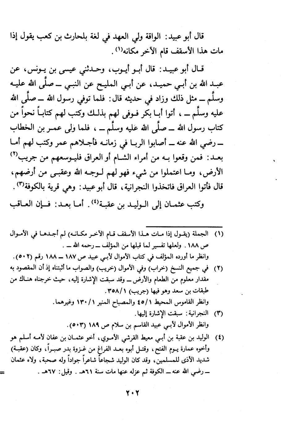 قَالَ أَبُو عُبَيْدٍ: قَالَ أَبُو أَيُّوبَ وَحَدَّثَنِي عِيسَى بْنُ يُونُسَ، عَنْ عَبْدِ اللَّهِ بْنِ أَبِي حُمَيْدٍ، عَنْ أَبِي الْمَلِيحِ، عَنِ النَّبِيِّ صَلَّى اللَّهُ عَلَيْهِ وَسَلَّمَ مِثْلَ ذَلِكَ، وَزَادَ فِي حَدِيثِهِ قَالَ: «فَلَمَّا تُوُفِّيَ رَسُولُ اللَّهِ صَلَّى اللَّهُ عَلَيْهِ وَسَلَّمَ أَتَوْا أَبَا بَكْرٍ، فَوَفَّى لَهُمْ بِذَلِكَ، وَكَتَبَ لَهُمْ كِتَابًا نَحْوًا مِنْ كِتَابِ رَسُولِ اللَّهِ صَلَّى اللَّهُ عَلَيْهِ وَسَلَّمَ، فَلَمَّا وُلِّيَ عُمَرُ بْنُ الْخَطَّابِ رَضِيَ اللَّهُ عَنْهُ أَصَابُوا الرِّبَا فِي زَمَانِهِ، فَأَجْلَاهُمْ عُمَرُ، وَكَتَبَ لَهُمْ: أَمَّا بَعْدُ فَمَنْ وَقَعُوا بِهِ مِنْ أُمَرَاءِ الشَّامِ أَوِ الْعِرَاقِ فَلْيُوسِعْهُمْ مِنْ جَرِيبِ الْأَرْضِ، وَمَا اعْتَمَلُوا مِنْ شَيْءٍ فَهُوَ لَهُمْ لِوَجْهِ اللَّهِ وَعُقْبَى مِنْ أَرْضِهِمْ، قَالَ فَأتَوُا الْعِرَاقَ فَاتَّخَذُوا النَّجْرَانِيَّةَ. قَالَ أَبُو عُبَيْدٍ: وَهِيَ قَرْيَةٌ بِالْكُوفَةِ» .