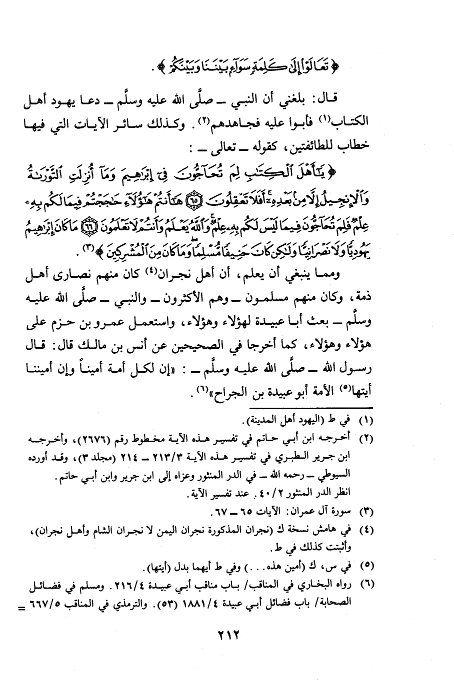قَالَ: بَلَغَنِي أَنَّ النَّبِيَّ صَلَّى اللَّهُ عَلَيْهِ وَسَلَّمَ دَعَا يَهُودَ أَهْلِ الْكِتَابِ فَأَبَوْا عَلَيْهِ فَجَاهَدَهُمْ، وَكَذَلِكَ سَائِرُ الْآيَاتِ الَّتِي فِيهَا خِطَابٌ لِلطَّائِفَتَيْنِ كَقَوْلِهِ تَعَالَى: {يَاأَهْلَ الْكِتَابِ لِمَ تُحَاجُّونَ فِي إِبْرَاهِيمَ وَمَا أُنْزِلَتِ التَّوْرَاةُ وَالْإِنْجِيلُ إِلَّا مِنْ بَعْدِهِ أَفَلَا تَعْقِلُونَ - هَا أَنْتُمْ هَؤُلَاءِ حَاجَجْتُمْ فِيمَا لَكُمْ بِهِ عِلْمٌ فَلِمَ تُحَاجُّونَ فِيمَا لَيْسَ لَكُمْ بِهِ عِلْمٌ وَاللَّهُ يَعْلَمُ وَأَنْتُمْ لَا تَعْلَمُونَ - مَا كَانَ إِبْرَاهِيمُ يَهُودِيًّا وَلَا نَصْرَانِيًّا وَلَكِنْ كَانَ حَنِيفًا مُسْلِمًا وَمَا كَانَ مِنَ الْمُشْرِكِينَ} [آل عمران: 65 - 67] .