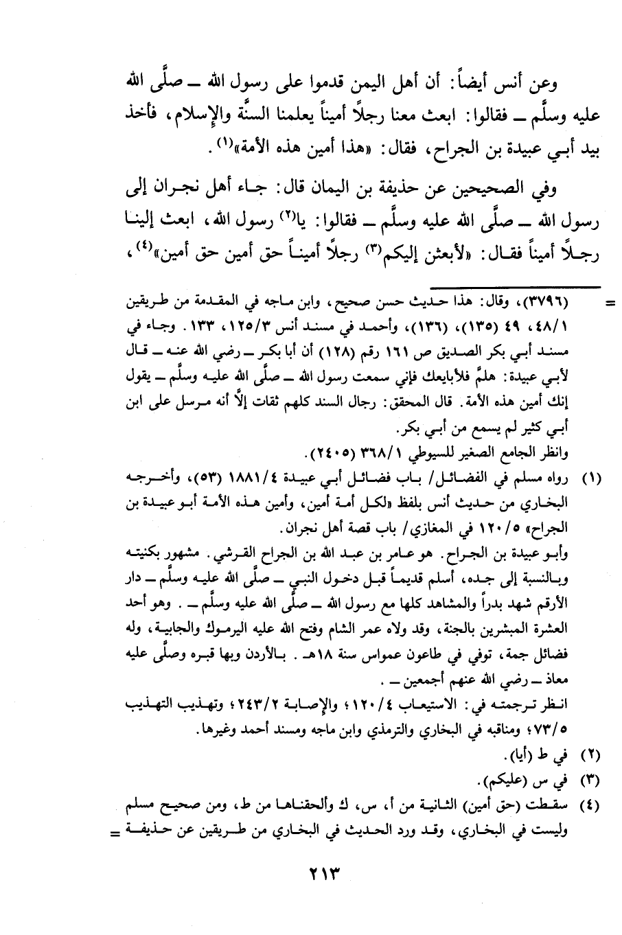 وَعَنْ أَنَسٍ أَيْضًا: أَنَّ أَهْلَ الْيَمَنِ قَدِمُوا عَلَى رَسُولِ اللَّهِ صَلَّى اللَّهُ عَلَيْهِ وَسَلَّمَ، فَقَالُوا ابْعَثْ مَعَنَا رَجُلًا أَمِينًا، يُعَلِّمُنَا السُّنَّةَ وَالْإِسْلَامَ، فَأَخَذَ بِيَدِ أَبِي عُبَيْدَةَ بْنِ الْجَرَّاحِ، فَقَالَ: هَذَا أَمِينُ هَذِهِ الْأُمَّةِ.