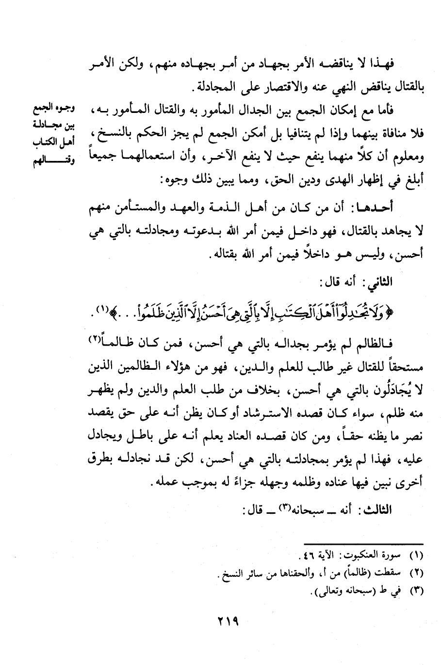 الثَّانِي: أَنَّهُ قَالَ: {وَلَا تُجَادِلُوا أَهْلَ الْكِتَابِ إِلَّا بِالَّتِي هِيَ أَحْسَنُ إِلَّا الَّذِينَ ظَلَمُوا} [العنكبوت: 46] .