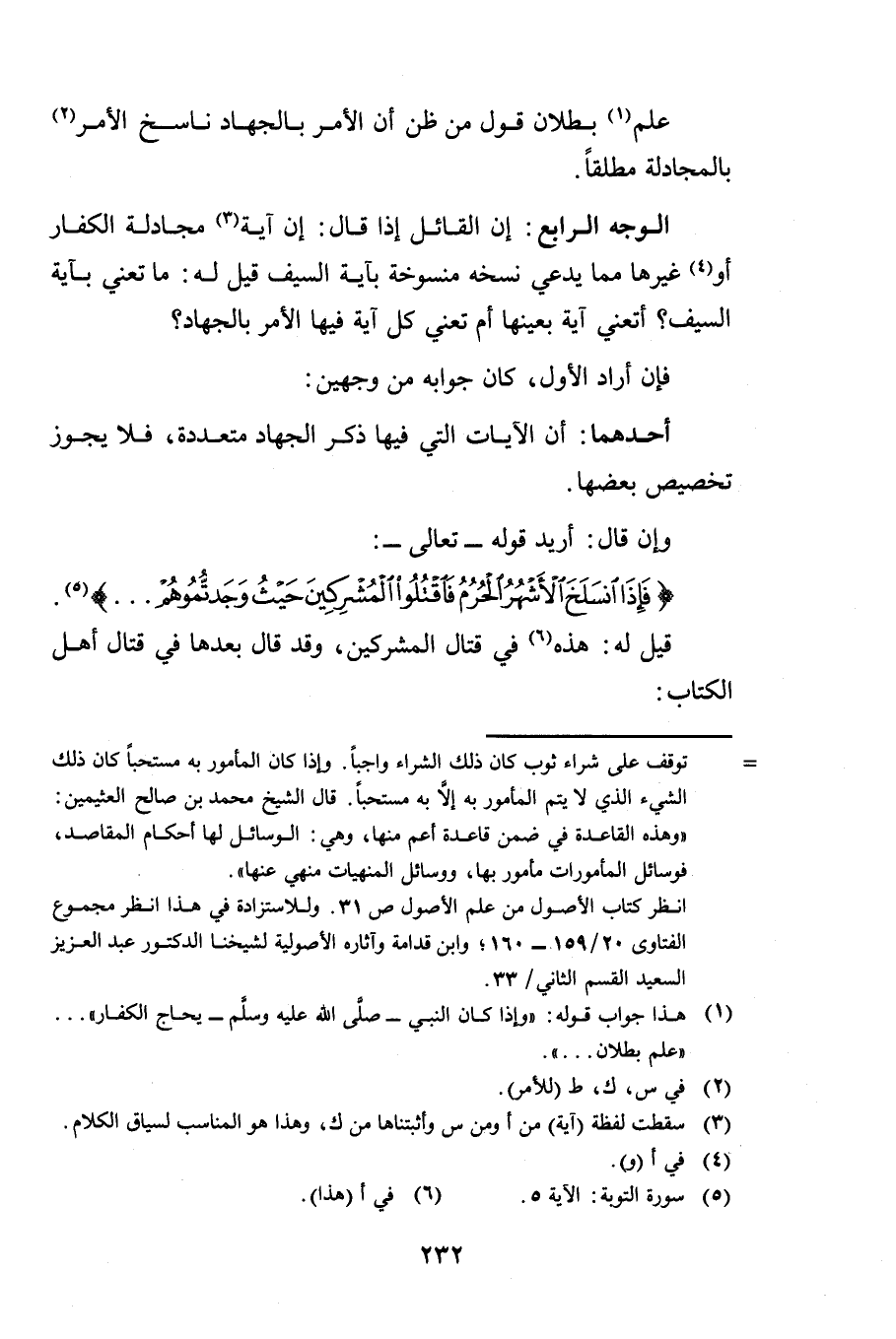 الْوَجْهُ الرَّابِعُ: إِنَّ الْقَائِلَ إِذَا قَالَ: إِنَّ آيَةَ مُجَادَلَةِ الْكُفَّارِ - أَوْ غَيْرَهَا مِمَّا يَدَّعِي نَسْخَهُ - مَنْسُوخَةٌ بِآيَةِ السَّيْفِ قِيلَ لَهُ: مَا تَعْنِي بِآيَةِ السَّيْفِ؟ أَتَعْنِي آيَةً بِعَيْنِهَا، أَمْ تَعْنِي كُلَّ آيَةٍ فِيهَا الْأَمْرُ بِالْجِهَادِ؟