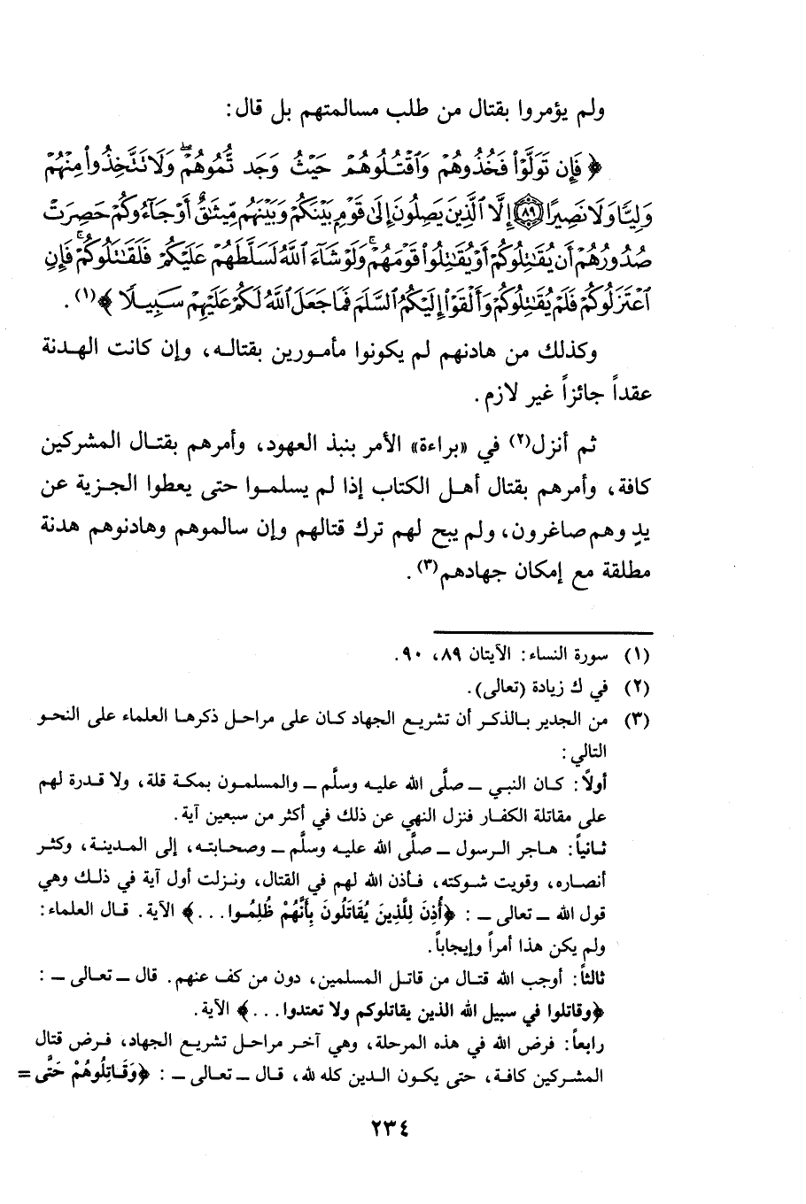 ثُمَّ أَنْزَلَ فِي (بَرَاءَةَ) الْأَمْرَ بِنَبْذِ الْعُهُودِ، وَأَمَرَهُمْ بِقِتَالِ الْمُشْرِكِينَ كَافَّةً، وَأَمَرَهُمْ بِقِتَالِ أَهْلِ الْكِتَابِ إِذَا لَمْ يُسْلِمُوا حَتَّى يُعْطُوا الْجِزْيَةَ عَنْ يَدٍ وَهُمْ صَاغِرُونَ، وَلَمْ يُبِحْ لَهُمْ تَرْكَ قِتَالِهِمْ وَإِنْ سَالَمُوهُمْ وَهَادَنُوهُمْ هُدْنَةً مُطْلَقَةً مَعَ إِمْكَانِ جِهَادِهِمْ.