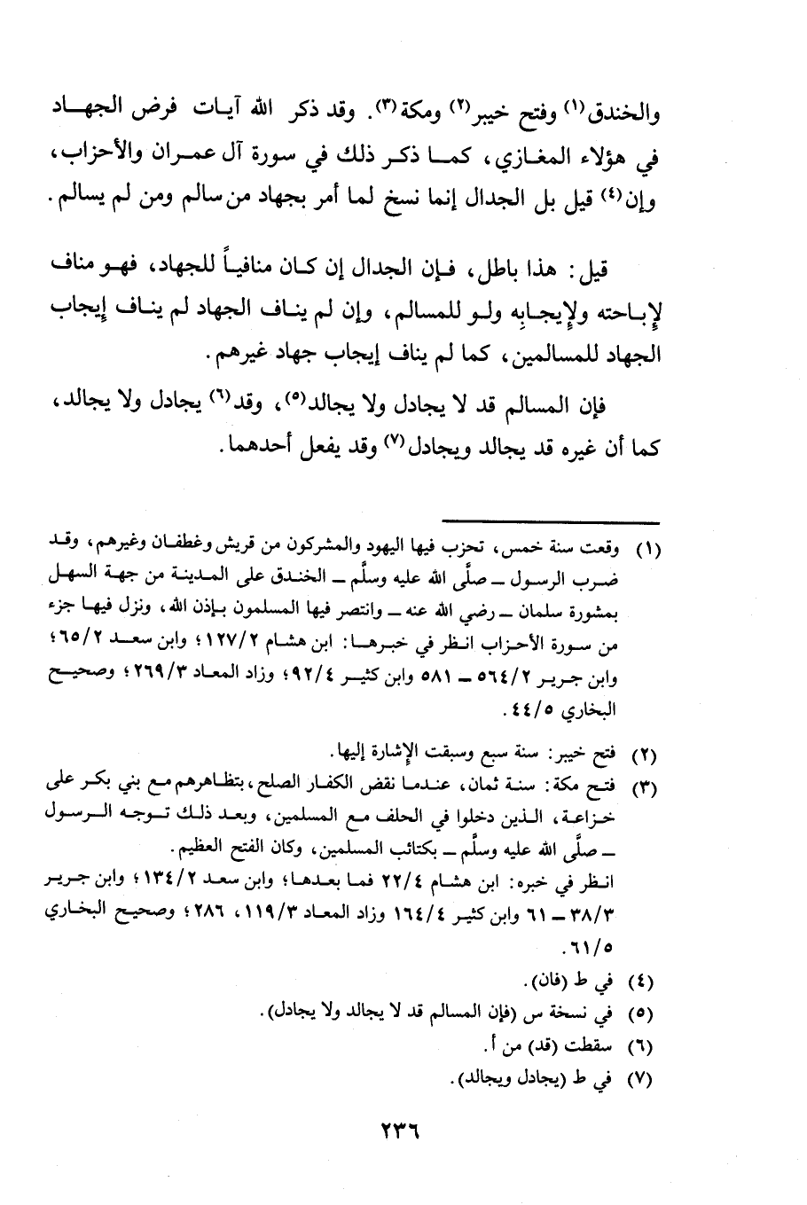 وَالْخَنْدَقِ وَفَتْحِ خَيْبَرَ وَمَكَّةَ، وَقَدْ ذَكَرَ اللَّهُ آيَاتِ فَرْضِ الْجِهَادِ فِي هَؤُلَاءِ الْمَغَازِي كَمَا ذَكَرَ ذَلِكَ فِي سُورَةِ آلِ عِمْرَانَ وَالْأَحْزَابِ. وَإِنْ قِيلَ: بَلِ الْجِدَالُ إِنَّمَا نُسِخَ لَمَّا أُمِرَ بِجِهَادِ مَنْ سَالَمَ وَمَنْ لَمْ يُسَالِمْ، قِيلَ: هَذَا بَاطِلٌ، فَإِنَّ الْجِدَالَ إِنْ كَانَ مُنَافِيًا لِلْجِهَادِ، فَهُوَ مُنَافٍ لِإِبَاحَتِهِ وَلِإِيجَابِهِ وَلَوْ لِلْمُسَالِمِ، وَإِنْ لَمْ يُنَافِ الْجِهَادَ لَمْ يُنَافِ إِيجَابَ الْجِهَادِ لِلْمُسَالِمِينَ، كَمَا لَمْ يُنَافِ إِيجَابَ جِهَادِ غَيْرِهِمْ. فَإِنَّ الْمُسَالِمَ قَدْ لَا يُجَادِلُ وَلَا يُجَالِدُ، وَقَدْ يُجَادِلُ وَلَا يُجَالِدُ، كَمَا أَنَّ غَيْرَهُ قَدْ يُجَالِدُ وَيُجَادِلُ وَقَدْ يَفْعَلُ أَحَدَهُمَا.