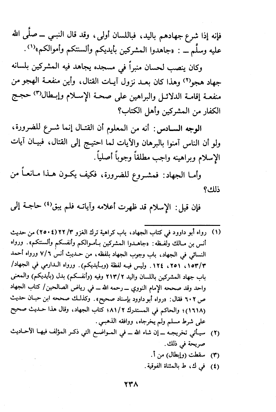 فَإِنَّهُ إِذَا شَرَعَ جِهَادَهُمْ بِالْيَدِ، فَبِاللِّسَانِ أَوْلَى، وَقَدْ قَالَ النَّبِيُّ صَلَّى اللَّهُ عَلَيْهِ وَسَلَّمَ: «جَاهِدُوا الْمُشْرِكِينَ بِأَيْدِيكُمْ وَأَلْسِنَتِكُمْ وَأَمْوَالِكُمْ» .