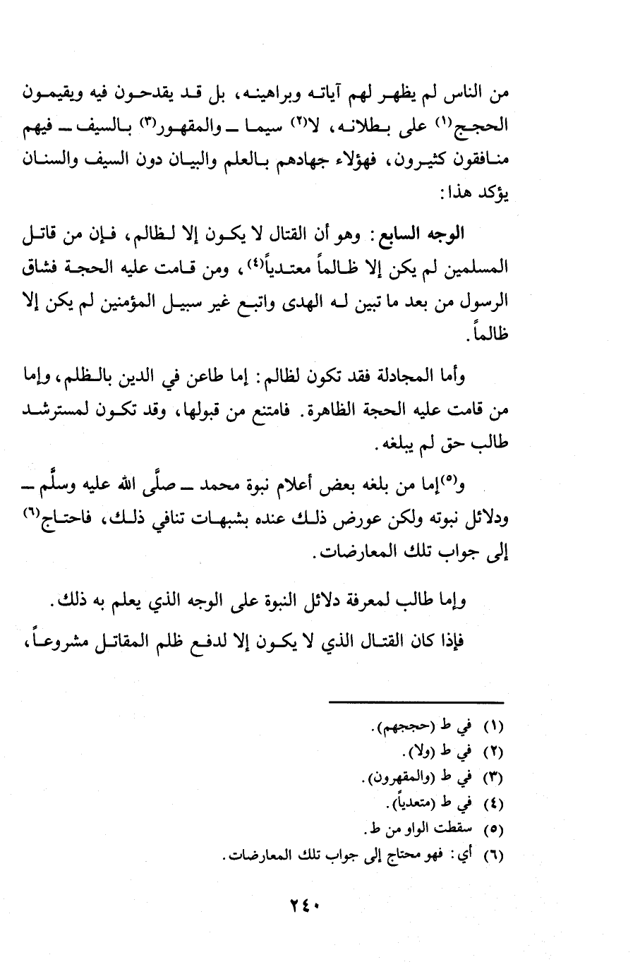 الْوَجْهُ السَّابِعُ: وَهُوَ أَنَّ الْقِتَالَ لَا يَكُونُ إِلَّا لِظَالِمٍ، فَإِنَّ مَنْ قَاتَلَ الْمُسْلِمِينَ لَمْ يَكُنْ إِلَّا ظَالِمًا مُعْتَدِيًا، وَمَنْ قَامَتْ عَلَيْهِ الْحُجَّةُ فَشَاقَّ الرَّسُولَ مِنْ بَعْدِ مَا تَبَيَّنَ لَهُ الْهُدَى، وَاتَّبَعَ غَيْرَ سَبِيلِ الْمُؤْمِنِينَ لَمْ يَكُنْ إِلَّا ظَالِمًا.