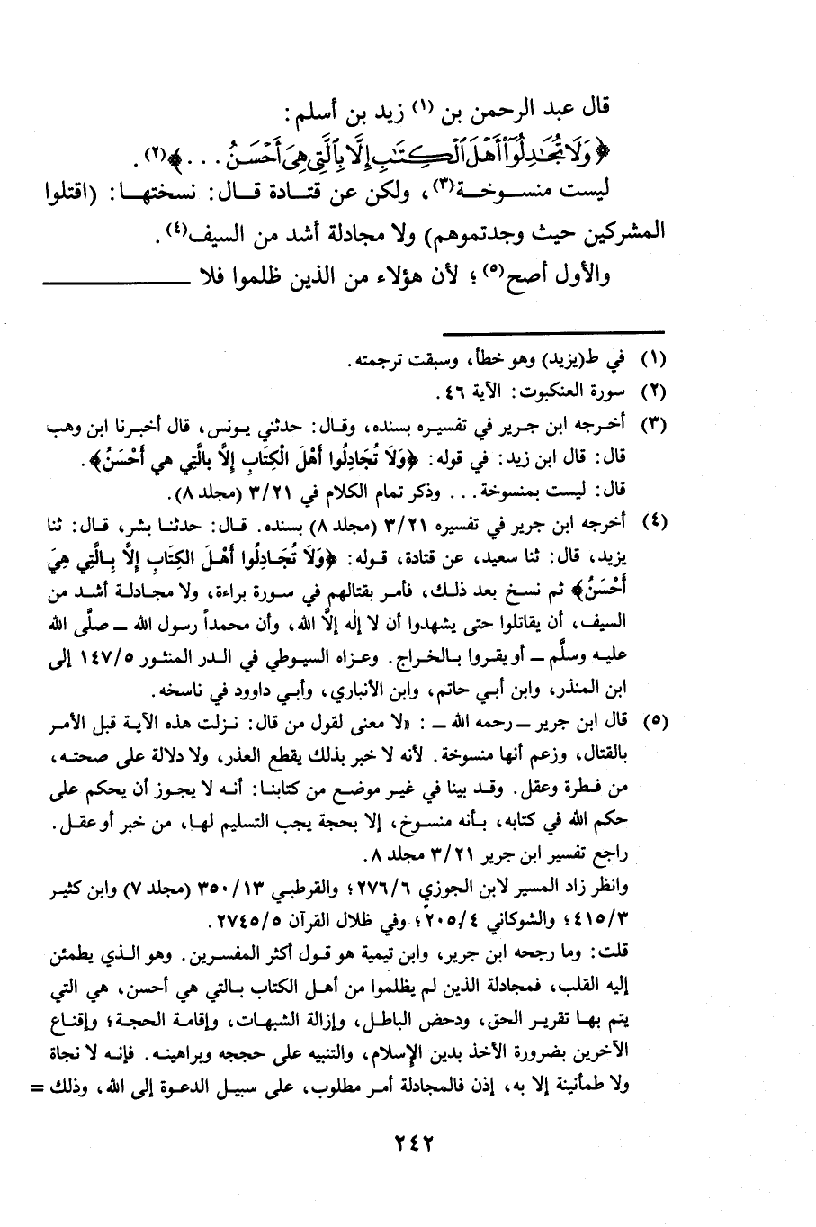 قَالَ عَبْدُ الرَّحْمَنِ بْنُ زَيْدِ بْنِ أَسْلَمَ: {وَلَا تُجَادِلُوا أَهْلَ الْكِتَابِ إِلَّا بِالَّتِي هِيَ أَحْسَنُ} [العنكبوت: 46] ، قَالَ: لَيْسَتْ مَنْسُوخَةً، وَلَكِنْ عَنْ قَتَادَةَ قَالَ: نَسَخَتْهَا {فَاقْتُلُوا الْمُشْرِكِينَ حَيْثُ وَجَدْتُمُوهُمْ} [التوبة: 5] ، وَلَا مُجَادَلَةَ أَشَدُّ مِنَ السَّيْفِ.