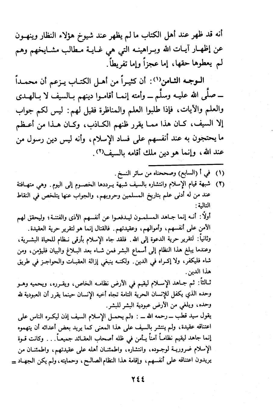 الْوَجْهُ الثَّامِنُ: أَنَّ كَثِيرًا مِنْ أَهْلِ الْكِتَابِ يَزْعُمُ أَنَّ مُحَمَّدًا صَلَّى اللَّهُ عَلَيْهِ وَسَلَّمَ وَأُمَّتَهُ إِنَّمَا أَقَامُوا دِينَهُمْ بِالسَّيْفِ لَا بِالْهُدَى وَالْعِلْمِ وَالْآيَاتِ، فَإِذَا طَلَبُوا الْعِلْمَ وَالْمُنَاظَرَةَ، فَقِيلَ: لَهُمْ لَيْسَ لَكُمْ جَوَابٌ إِلَّا السَّيْفَ، كَانَ هَذَا مِمَّا يُقَرِّرُ ظَنَّهُمُ الْكَاذِبَ، وَكَانَ هَذَا مِنْ أَعْظَمِ مَا يَحْتَجُّونَ بِهِ عِنْدَ أَنْفُسِهِمْ عَلَى فَسَادِ الْإِسْلَامِ، وَأَنَّهُ لَيْسَ دِينُ رَسُولٍ مِنْ عِنْدِ اللَّهِ، وَإِنَّمَا هُوَ دِينُ مَلِكٍ أَقَامَهُ بِالسَّيْفِ.