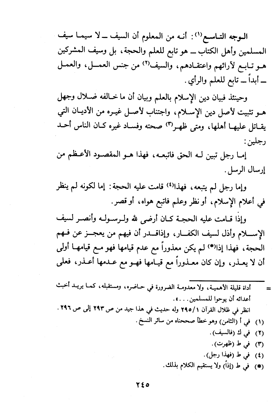 الْوَجْهُ التَّاسِعُ: أَنَّهُ مِنَ الْمَعْلُومِ أَنَّ السَّيْفَ لَا سِيَّمَا سَيْفِ الْمُسْلِمِينَ وَأَهْلِ الْكِتَابِ هُوَ تَابِعٌ لِلْعِلْمِ وَالْحُجَّةِ، بَلْ وَسَيْفُ الْمُشْرِكِينَ هُوَ تَابِعٌ لِآرَائِهِمْ وَاعْتِقَادِهِمْ، وَالسَّيْفُ مِنْ جِنْسِ الْعَمَلِ، وَالْعَمَلُ - أَبَدًا - تَابِعٌ لِلْعِلْمِ وَالرَّأْيِ.