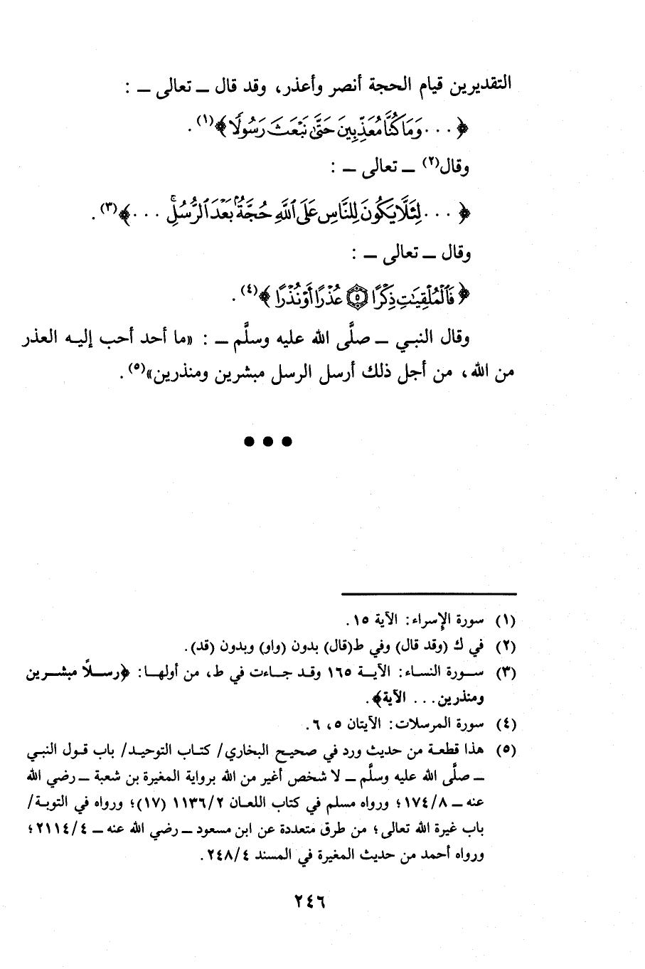 وَقَالَ تَعَالَى: {فَالْمُلْقِيَاتِ ذِكْرًا عُذْرًا أَوْ نُذْرًا} [المرسلات: 5] وَقَالَ النَّبِيُّ صَلَّى اللَّهُ عَلَيْهِ وَسَلَّمَ: «مَا أَحَدٌ أَحَبُّ إِلَيْهِ الْعُذْرُ مِنَ اللَّهِ، مِنْ أَجْلِ ذَلِكَ أَرْسَلَ الرُّسُلَ مُبَشِّرِينَ وَمُنْذِرِينَ» .