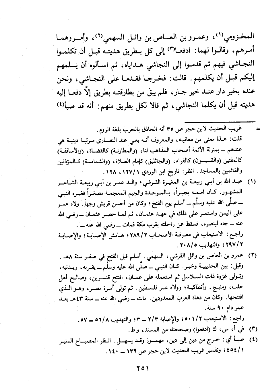 الْمَخْزُومِيَّ، وَعَمْرَو بْنَ الْعَاصِ بْنِ وَائِلٍ السَّهْمِيَّ، وَأَمَرُوهُمَا أَمْرَهُمْ، وَقَالُوا لَهُمَا: ادْفَعَا إِلَى كُلِّ بِطْرِيقٍ هَدِيَّتَهُ قَبْلَ أَنْ تُكَلِّمُوا النَّجَاشِيَّ فِيهِمْ، ثُمَّ قَدِّمُوا إِلَى النَّجَاشِيِّ هَدَايَاهُ، ثُمَّ اسْأَلُوهُ أَنْ يُسَلِّمَهُمْ إِلَيْكُمْ قَبْلَ أَنْ يُكَلِّمَهُمْ، قَالَتْ: فَخَرَجَا، فَقَدِمَا عَلَى النَّجَاشِيِّ، وَنَحْنُ عِنْدُهُ بِخَيْرِ دَارٍ عِنْدَ خَيْرِ جَارٍ، فَلَمْ يَبْقَ مِنْ بَطَارِقَتِهِ بِطَرِيقٌ إِلَّا دَفَعَا إِلَيْهِ هَدِيَّتَهُ قَبْلَ أَنْ يُكَلِّمَا النَّجَاشِيَّ، ثُمَّ قَالَا لِكُلِّ بِطْرِيقٍ مِنْهُمْ: إِنَّهُ قَدْ صَبَأَ