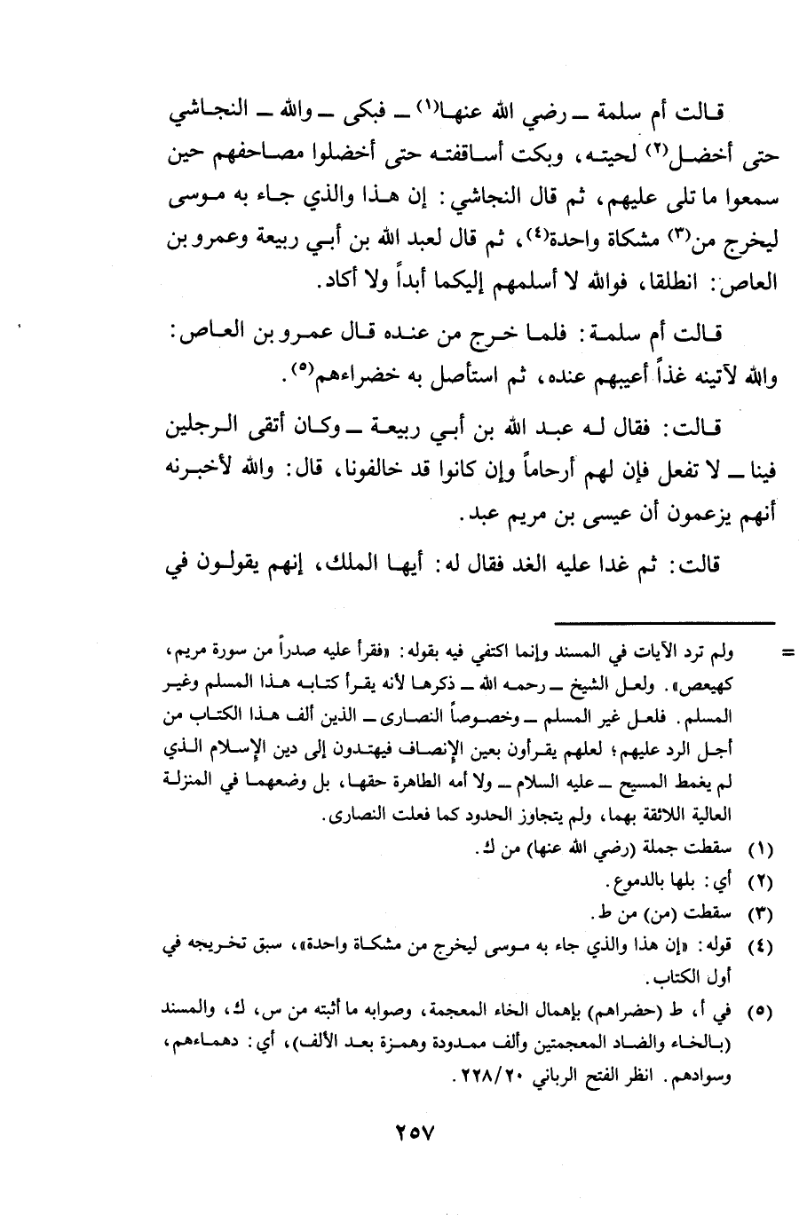 قَالَتْ أَمُّ سَلَمَةَ رَضِيَ اللَّهُ عَنْهَا، فَبَكَى وَاللَّهِ النَّجَاشِيُّ حَتَّى أَخْضَلَ لِحْيَتَهُ، وَبَكَتْ أَسَاقِفَتُهُ حَتَّى أَخْضَلُوا مَصَاحِفَهُمْ حِينَ سَمِعُوا مَا تُلِيَ عَلَيْهِمْ، ثُمَّ قَالَ النَّجَاشِيُّ: إِنَّ هَذَا وَالَّذِي جَاءَ بِهِ مُوسَى لَيَخْرُجُ مِنْ مِشْكَاةٍ وَاحِدَةٍ، ثُمَّ قَالَ لِعَبْدِ اللَّهِ بْنِ أَبِي رَبِيعَةَ وَعَمْرِو بْنِ الْعَاصِ: انْطَلِقَا فَوَاللَّهِ لَا أُسَلِّمُهُمْ إِلَيْكُمَا أَبَدًا وَلَا أُكَادُ.