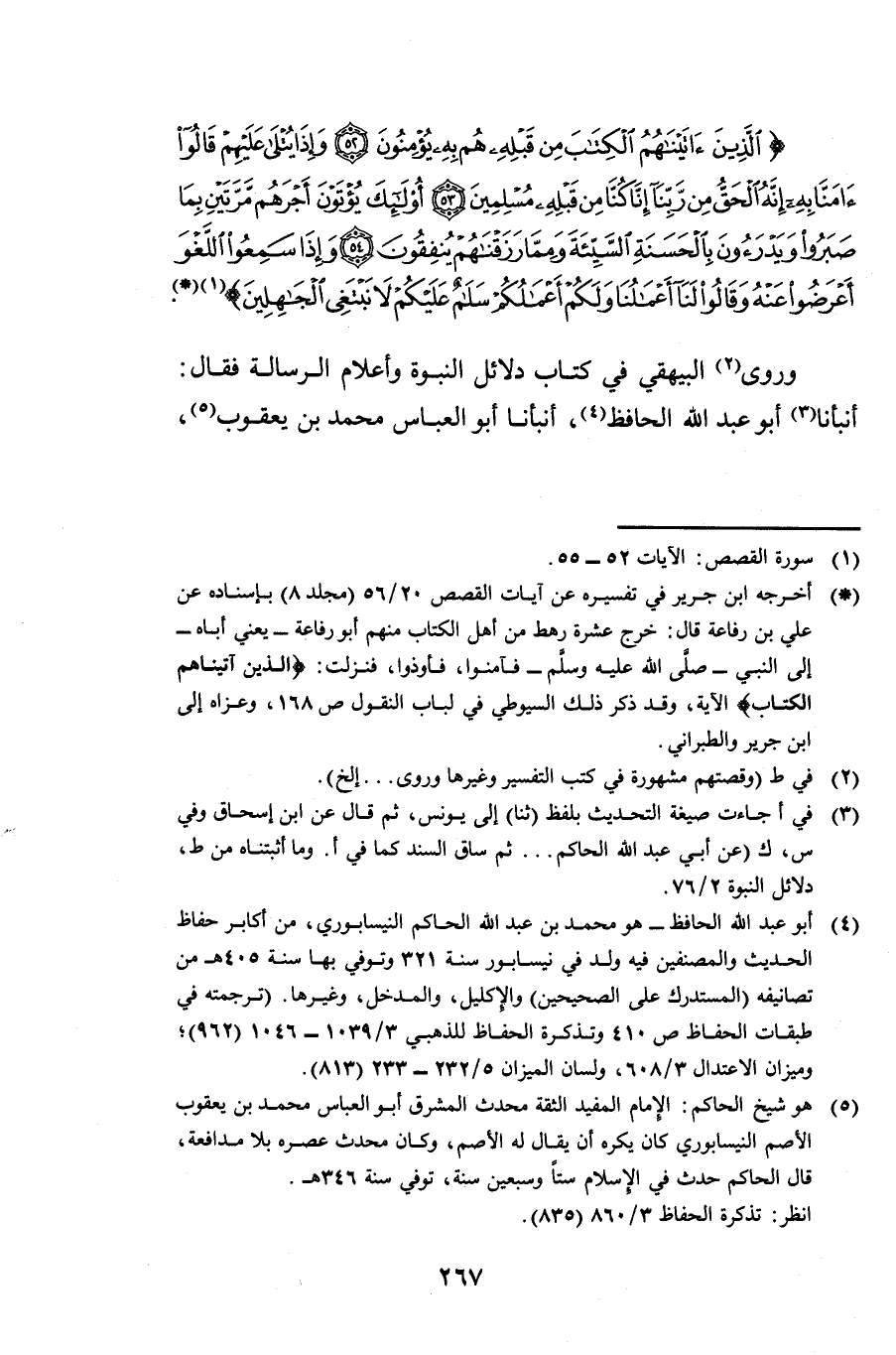 {الَّذِينَ آتَيْنَاهُمُ الْكِتَابَ مِنْ قَبْلِهِ هُمْ بِهِ يُؤْمِنُونَ - وَإِذَا يُتْلَى عَلَيْهِمْ قَالُوا آمَنَّا بِهِ إِنَّهُ الْحَقُّ مِنْ رَبِّنَا إِنَّا كُنَّا مِنْ قَبْلِهِ مُسْلِمِينَ - أُولَئِكَ يُؤْتَوْنَ أَجْرَهُمْ مَرَّتَيْنِ بِمَا صَبَرُوا وَيَدْرَءُونَ بِالْحَسَنَةِ السَّيِّئَةَ وَمِمَّا رَزَقْنَاهُمْ يُنْفِقُونَ - وَإِذَا سَمِعُوا اللَّغْوَ أَعْرَضُوا عَنْهُ وَقَالُوا لَنَا أَعْمَالُنَا وَلَكُمْ أَعْمَالُكُمْ سَلَامٌ عَلَيْكُمْ لَا نَبْتَغِي الْجَاهِلِينَ} [القصص: 52 - 55] .