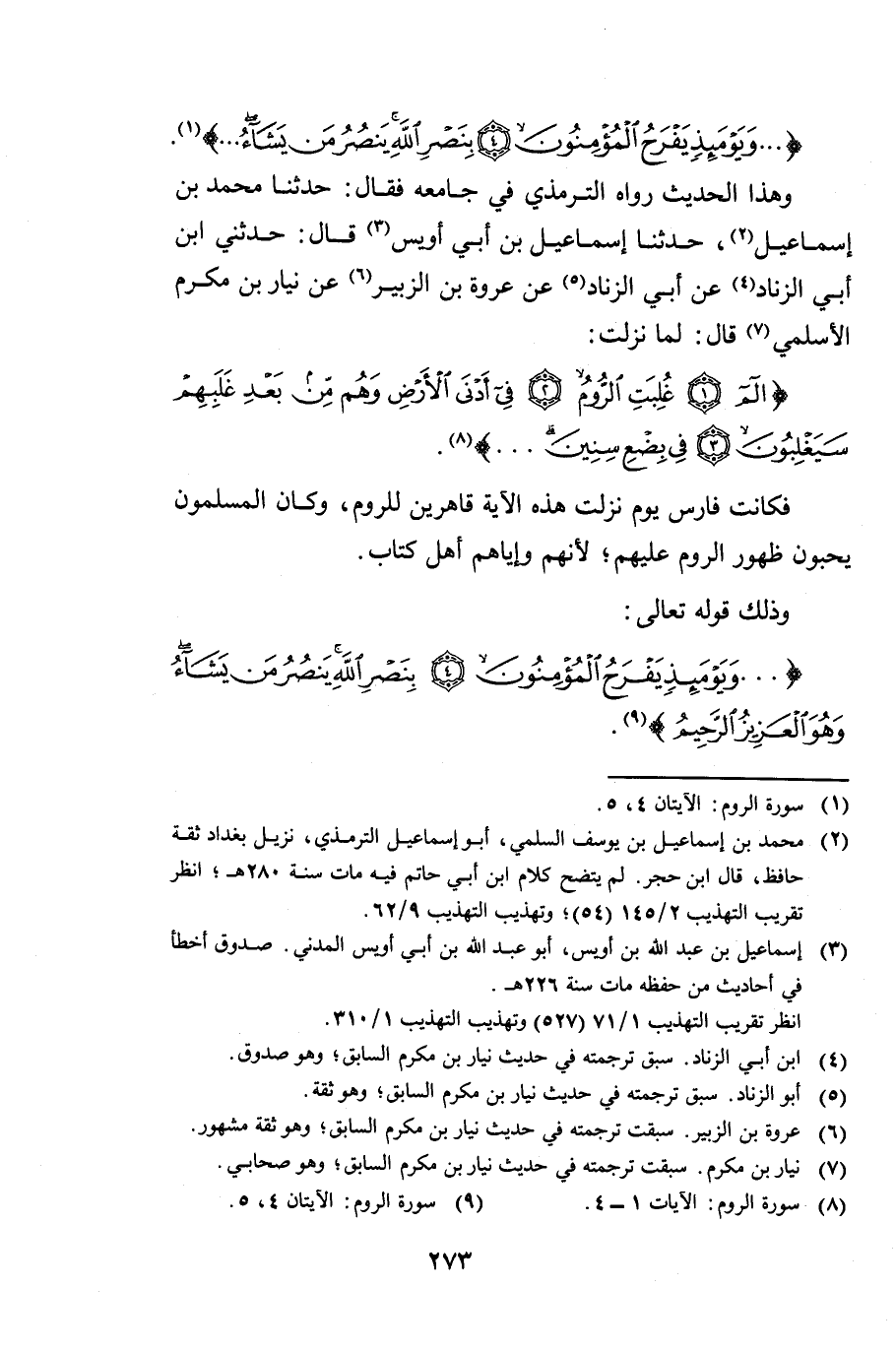 وَهَذَا الْحَدِيثُ رَوَاهُ التِّرْمِذِيُّ فِي جَامِعِهِ فَقَالَ: حَدَّثَنَا مُحَمَّدُ بْنُ إِسْمَاعِيلَ حَدَّثَنَا إِسْمَاعِيلُ بْنُ أُوَيْسٍ، قَالَ: حَدَّثَنِي ابْنُ أَبِي الزِّنَادِ، عَنْ أَبِي الزِّنَادِ، عَنْ عُرْوَةَ بْنِ الزُّبَيْرِ، عَنْ نِيَارِ بْنِ مُكْرَمٍ الْأَسْلَمِيِّ، قَالَ: لَمَّا نَزَلَتْ: {الم - غُلِبَتِ الرُّومُ - فِي أَدْنَى الْأَرْضِ وَهُمْ مِنْ بَعْدِ غَلَبِهِمْ سَيَغْلِبُونَ - فِي بِضْعِ سِنِينَ} [الروم: 1 - 4] . فَكَانَتْ فَارِسُ يَوْمَ نَزَلَتْ هَذِهِ الْآيَةُ قَاهِرِينَ لِلرُّومِ، وَكَانَ الْمُسْلِمُونَ يُحِبُّونَ ظُهُورَ الرُّومِ عَلَيْهِمْ لِأَنَّهُمْ وَإِيَّاهُمْ أَهْلُ كِتَابٍ.