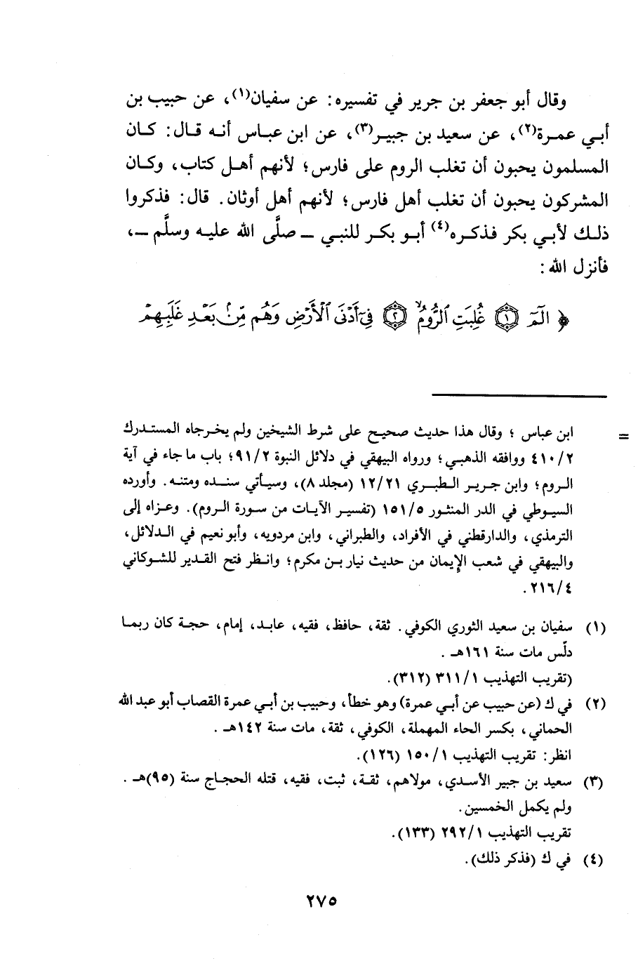 وَقَالَ أَبُو جَعْفَرِ بْنُ جَرِيرٍ فِي تَفْسِيرِهِ: عَنْ سُفْيَانَ، عَنْ حَبِيبِ بْنِ أَبِي عَمْرَةَ عَنْ سَعِيدِ بْنِ جُبَيْرٍ، عَنِ ابْنِ عَبَّاسٍ أَنَّهُ قَالَ: كَانَ الْمُسْلِمُونَ يُحِبُّونَ أَنْ تَغْلِبَ الرُّومُ عَلَى فَارِسَ ; لِأَنَّهُمْ أَهْلُ كِتَابٍ وَكَانَ الْمُشْرِكُونَ يُحِبُّونَ أَنْ تَغْلِبَ أَهْلُ فَارِسَ ; لِأَنَّهُمْ أَهْلُ أَوْثَانٍ، قَالَ فَذَكَرُوا ذَلِكَ لِأَبِي بَكْرٍ فَذَكَرَهُ أَبُو بَكْرٍ لِلنَّبِيِّ صَلَّى اللَّهُ عَلَيْهِ وَسَلَّمَ فَأَنْزَلَ اللَّهُ: {الم - غُلِبَتِ الرُّومُ - فِي أَدْنَى الْأَرْضِ وَهُمْ مِنْ بَعْدِ غَلَبِهِمْ سَيَغْلِبُونَ - فِي بِضْعِ سِنِينَ لِلَّهِ الْأَمْرُ مِنْ قَبْلُ وَمِنْ بَعْدُ وَيَوْمَئِذٍ يَفْرَحُ الْمُؤْمِنُونَ} [الروم: 1 - 4] .