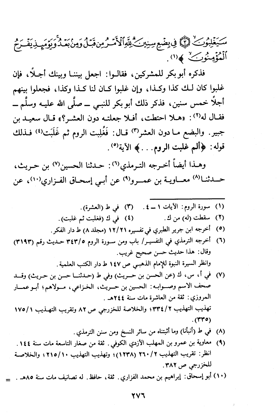 فَذَكَرَهُ أَبُو بَكْرٍ لِلْمُشْرِكِينَ، فَقَالُوا: اجْعَلْ بَيْنَنَا وَبَيْنَكَ أَجَلًا، فَإِنْ غَلَبُوا كَانَ لَكَ كَذَا وَكَذَا، وَإِنْ غُلِبُوا كَانَ لَنَا كَذَا وَكَذَا، فَجَعَلُوا بَيْنَهُمْ أَجَلًا خَمْسَ سِنِينَ، «فَذَكَرَ ذَلِكَ أَبُو بَكْرٍ لِلنَّبِيِّ صَلَّى اللَّهُ عَلَيْهِ وَسَلَّمَ فَقَالَ لَهُ: هَلَّا احْتَطْتَ، أَفَلَا جَعَلْتَهُ دُونَ الْعَشَرَةِ؟» قَالَ سَعِيدُ بْنُ جُبَيْرٍ: وَالْبِضْعُ: مَا دُونَ الْعَشْرِ. قَالَ فَغُلِبَتِ الرُّومُ، ثُمَّ غَلَبَتْ فَذَلِكَ قَوْلُهُ {الم - غُلِبَتِ الرُّومُ} [الروم: 1 - 2] .