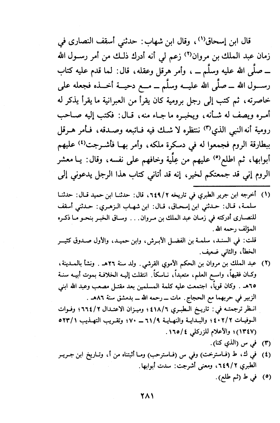 قَالَ ابْنُ إِسْحَاقَ، وَقَالَ ابْنُ شِهَابٍ: حَدَّثَنِي أُسْقُفُّ النَّصَارَى فِي زَمَانِ عَبْدِ الْمَلِكِ بْنِ مَرْوَانَ، زَعَمَ لِي أَنَّهُ أَدْرَكَ ذَلِكَ مِنْ أَمْرِ رَسُولِ اللَّهِ صَلَّى اللَّهُ عَلَيْهِ وَسَلَّمَ، وَأَمْرِ هِرَقْلَ وَعَقْلِهِ، قَالَ: لَمَّا قَدِمَ عَلَيْهِ كِتَابُ رَسُولِ اللَّهِ صَلَّى اللَّهُ عَلَيْهِ وَسَلَّمَ مَعَ دِحْيَةَ أَخَذَهُ فَجَعَلَهُ عَلَى خَاصِرَتِهِ، ثُمَّ كَتَبَ إِلَى رَجُلٍ بِرُومِيَّةَ كَانَ يَقْرَأُ مِنَ الْعِبْرَانِيَّةِ مَا يَقْرَأُ يَذْكُرُ لَهُ أَمْرَهُ وَيَصِفُ لَهُ شَأْنَهُ وَيُخْبِرُهُ مَا جَاءَ مِنْهُ، قَالَ: فَكَتَبَ إِلَيْهِ صَاحِبُ رُومِيَّةَ أَنَّهُ النَّبِيُّ الَّذِي نَنْتَظِرُهُ لَا شَكَّ فِيهِ فَاتَّبِعْهُ وَصَدِّقْهُ، فَأَمَرَ هِرَقْلُ بِبَطَارِقَةِ الرُّومِ، فَجُمِعُوا لَهُ فِي دَسْكَرَةِ مُلْكِهِ، وَأَمَرَ بِهَا فَأُشْرِجَتْ عَلَيْهِمْ أَبْوَابُهَا، ثُمَّ اطَّلَعَ عَلَيْهِمْ مِنْ عِلِّيَةٍ، وَخَافَهُمْ عَلَى نَفْسِهِ، وَقَالَ: يَا مَعْشَرَ الرُّومِ إِنِّي قَدْ جَمَعْتُكُمْ لِخَيْرٍ، إِنَّهُ قَدْ أَتَانِي كِتَابُ هَذَا الرَّجُلِ يَدْعُونِي إِلَى