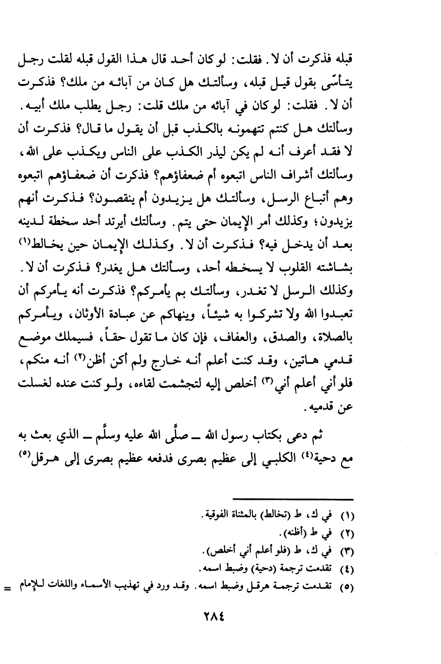قَبْلَهُ فَذَكَرْتَ أَنْ لَا. فَقُلْتُ: لَوْ كَانَ أَحَدٌ قَالَ هَذَا الْقَوْلَ قَبْلَهُ لَقُلْتُ رَجُلٌ يَتَأَسَّى بِقَوْلٍ قِيلَ قَبْلَهُ. وَسَأَلْتُكَ: هَلْ كَانَ مِنْ آبَائِهِ مَنْ مَلَكَ؟ فَذَكَرْتَ أَنْ لَا، فَقُلْتُ لَوْ كَانَ فِي آبَائِهِ مَنْ مَلَكَ قُلْتُ رَجُلٌ يَطْلُبُ مُلْكَ أَبِيهِ. وَسَأَلْتُكَ: هَلْ كُنْتُمْ تَتَّهِمُونَهُ بِالْكَذِبِ قَبْلَ أَنْ يَقُولَ مَا قَالَ؟ فَذَكَرْتَ أَنْ لَا، فَقَدْ أَعْرِفُ أَنَّهُ لَمْ يَكُنْ لِيَذَرَ الْكَذِبَ عَلَى النَّاسِ وَيَكْذِبَ عَلَى اللَّهِ. وَسَأَلْتُكَ: أَشْرَافُ النَّاسِ اتَّبَعُوهُ أَمْ ضُعَفَاؤُهُمْ؟ فَذَكَرْتَ أَنَّ ضُعَفَاءَهُمُ اتَّبَعُوهُ وَهُمْ أَتْبَاعُ الرُّسُلِ. وَسَأَلْتُكَ: هَلْ يَزِيدُونَ أَمْ يَنْقُصُونَ؟ فَذَكَرْتَ أَنَّهُمْ يَزِيدُونَ، وَكَذَلِكَ أَمْرُ الْإِيمَانِ حَتَّى يَتِمَّ. وَسَأَلْتُكَ: أَيَرْتَدُّ أَحَدٌ سَخْطَةً لِدِينِهِ بَعْدَ أَنْ يَدْخُلَ فِيهِ؟ فَذَكَرْتَ أَنْ لَا، وَكَذَلِكَ الْإِيمَانُ حِينَ يُخَالِطُ بَشَاشَتُهُ الْقُلُوبَ، لَا يَسْخَطُهُ أَحَدٌ. وَسَأَلْتُكَ: هَلْ يَغْدِرُ فَذَكَرْتَ أَنْ لَا، وَكَذَلِكَ الرُّسُلُ لَا تَغْدِرُ. وَسَأَلْتُكَ: بِمَ يَأْمُرُكُمْ؟ فَذَكَرْتَ أَنَّهُ يَأْمُرُكُمْ أَنْ تَعْبُدُوا اللَّهَ وَلَا تُشْرِكُوا بِهِ شَيْئًا، وَيَنْهَاكُمْ عَنْ عِبَادَةِ الْأَوْثَانِ، وَيَأْمُرُكُمْ بِالصَّلَاةِ وَالصِّدْقِ وَالْعَفَافِ، فَإِنْ كَانَ مَا تَقُولُ حَقًّا فَسَيَمْلِكُ مَوْضِعَ قَدَمَيَّ هَاتَيْنِ، وَقَدْ كُنْتُ أَعْلَمُ أَنَّهُ خَارِجٌ، وَلَمْ أَكُنْ أَظُنُّ أَنَّهُ مِنْكُمْ، فَلَوْ أَنِّي أَعْلَمُ أَنِّي أَخْلُصُ إِلَيْهِ لَتَجَشَّمْتُ لِقَاءَهُ، وَلَوْ كُنْتُ عِنْدَهُ لَغَسَلْتُ عَنْ قَدَمَيْهِ.