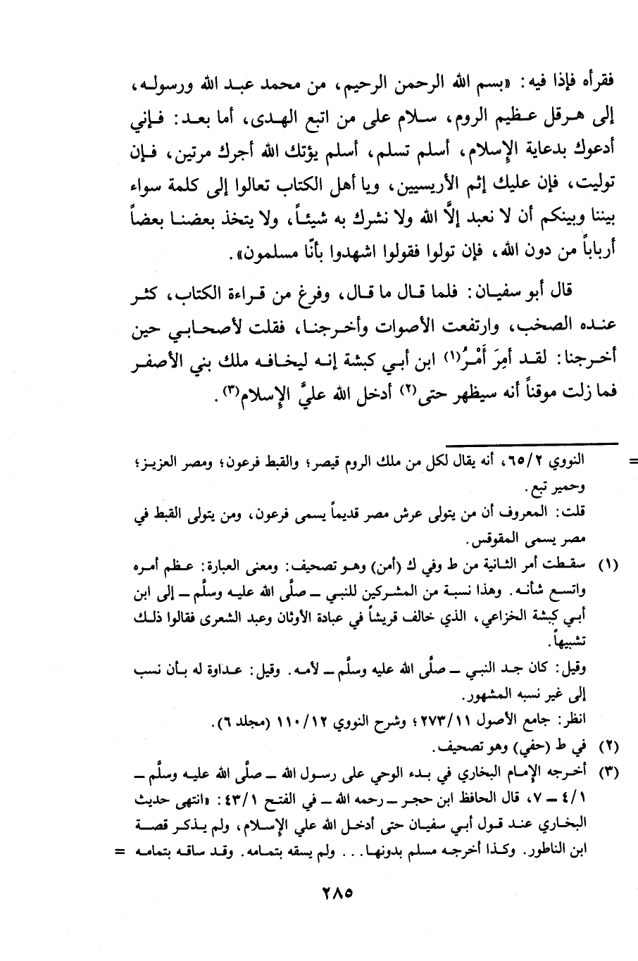 فَقَرَأَهُ فَإِذَا فِيهِ: «بِسْمِ اللَّهِ الرَّحْمَنِ الرَّحِيمِ مِنْ مُحَمَّدٍ عَبْدِ اللَّهِ وَرَسُولِهِ إِلَى هِرَقْلَ عَظِيمِ الرُّومِ سَلَامٌ عَلَى مَنِ اتَّبَعَ الْهُدَى، أَمَّا بَعْدُ فَإِنِّي أَدْعُوكَ بِدَعَايَةِ الْإِسْلَامِ، أَسْلِمْ تَسْلَمْ، أَسْلِمْ يُؤْتِكَ اللَّهُ أَجْرَكَ مَرَّتَيْنِ، فَإِنْ تَوَلَّيْتَ فَإِنَّ عَلَيْكَ إِثْمَ الْأَرِيسِيِّينَ، وَ {يَاأَهْلَ الْكِتَابِ تَعَالَوْا إِلَى كَلِمَةٍ سَوَاءٍ بَيْنَنَا وَبَيْنَكُمْ أَنْ لَا نَعْبُدَ إِلَّا اللَّهَ، وَلَا نُشْرِكَ بِهِ شَيْئًا، وَلَا يَتَّخِذَ بَعْضُنَا بَعْضًا أَرْبَابًا مِنْ دُونِ اللَّهِ، فَإِنْ تَوَلَّوْا فَقُولُوا اشْهَدُوا بِأَنَّا مُسْلِمُونَ} [آل عمران: 64] » .