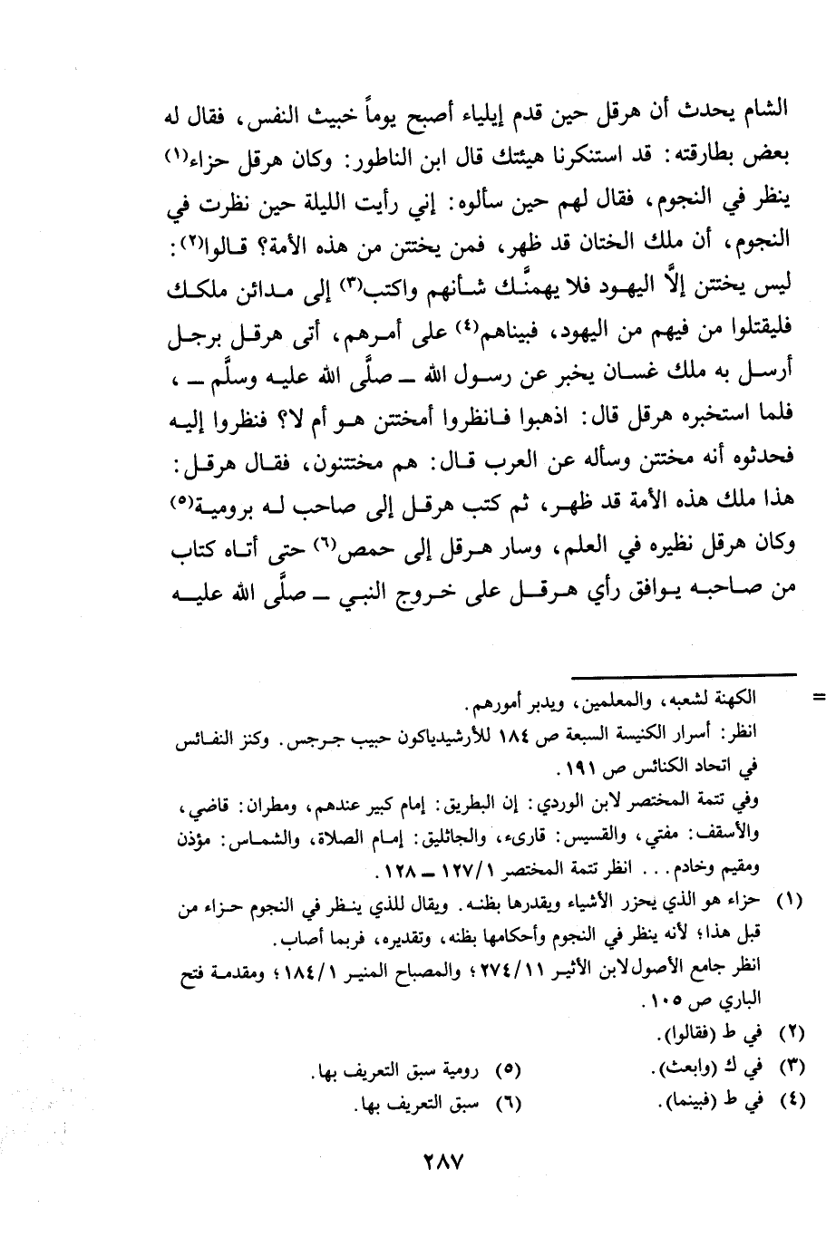 الشَّامِ يُحَدِّثُ أَنَّ هِرَقْلَ حِينَ قَدِمَ إِيلِيَا أَصْبَحَ يَوْمًا خَبِيثَ النَّفْسِ، فَقَالَ لَهُ بَعْضُ بَطَارِقَتِهِ: قَدِ اسْتَنْكَرْنَا هَيْئَتَكَ. قَالَ ابْنُ النَّاطُورِ: وَكَانَ هِرَقْلُ حَزَّاءً يَنْظُرُ فِي النُّجُومِ، فَقَالَ لَهُمْ حِينَ سَأَلُوهُ: إِنِّي رَأَيْتُ اللَّيْلَةَ حِينَ نَظَرْتُ فِي النُّجُومِ أَنَّ مَلِكَ الْخِتَانِ قَدْ ظَهَرَ، فَمَنْ يَخْتَتِنُ مِنْ هَذِهِ الْأُمَّةِ؟ ، قَالُوا: لَيْسَ يَخْتَتِنُ إِلَّا الْيَهُودُ فَلَا يُهِمَّنَّكَ شَأْنُهُمْ، وَاكْتُبْ إِلَى مَدَائِنِ مُلْكِكَ فَلْيَقْتُلُوا مَنْ فِيهِمْ مِنَ الْيَهُودِ، فَبَيْنَا هُمْ عَلَى أَمْرِهِمْ، أُتِيَ هِرَقْلُ بِرَجُلٍ أَرْسَلَ بِهِ مَلِكُ غَسَّانَ يُخْبِرُ عَنْ رَسُولِ اللَّهِ صَلَّى اللَّهُ عَلَيْهِ وَسَلَّمَ، فَلَمَّا اسْتَخْبَرَهُ هِرَقْلُ قَالَ: اذْهَبُوا فَانْظُرُوا أَمُخْتَتِنٌ هُوَ أَمْ لَا؟ فَنَظَرُوا إِلَيْهِ فَحَدَّثُوهُ أَنَّهُ مُخْتَتِنٌ، وَسَأَلَهُ عَنِ الْعَرَبِ قَالَ: هُمْ مُخْتَتِنُونَ، فَقَالَ هِرَقْلُ: هَذَا مَلِكُ هَذِهِ الْأُمَّةِ قَدْ ظَهَرَ، ثُمَّ كَتَبَ هِرَقْلُ إِلَى صَاحِبٍ لَهُ بِرُومِيَّةَ وَكَانَ هِرَقْلُ نَظِيرَهُ فِي الْعِلْمِ، وَسَارَ هِرَقْلُ إِلَى حِمْصَ حَتَّى أَتَاهُ كِتَابٌ مِنْ صَاحِبِهِ يُوَافِقُ رَأْيَ هِرَقْلَ عَلَى خُرُوجِ النَّبِيِّ صَلَّى اللَّهُ عَلَيْهِ