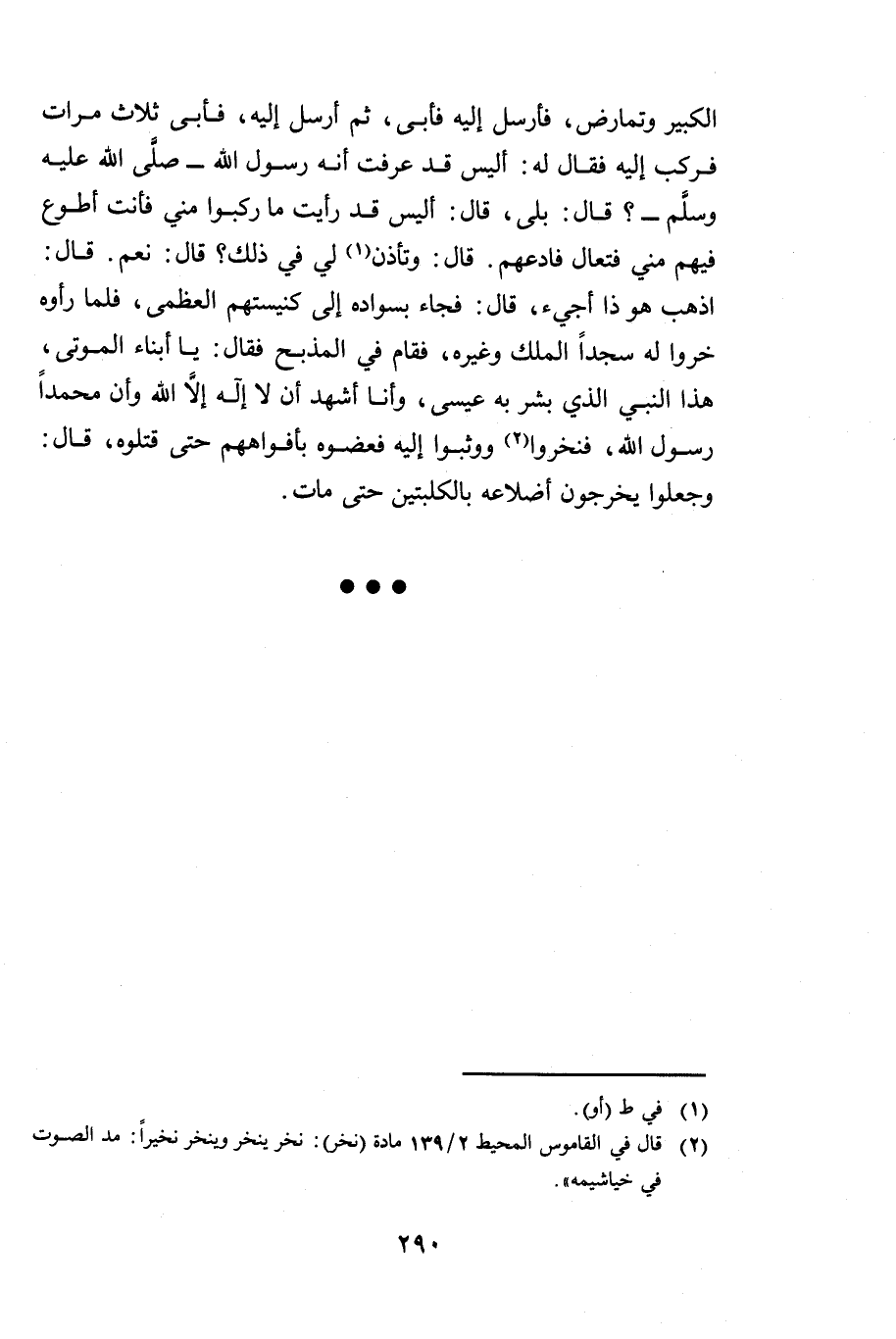 الْكَبِيرُ وَتَمَارَضَ، فَأَرْسَلَ إِلَيْهِ فَأَبَى، ثُمَّ أَرْسَلَ إِلَيْهِ فَأَبَى ثَلَاثَ مَرَّاتٍ، فَرَكِبَ إِلَيْهِ فَقَالَ لَهُ: أَلَيْسَ قَدْ عَرَفْتَ أَنَّهُ رَسُولُ اللَّهِ صَلَّى اللَّهُ عَلَيْهِ وَسَلَّمَ؟ قَالَ: بَلَى، قَالَ: أَلَيْسَ قَدْ رَأَيْتَ مَا رَكِبُوا مِنِّي فَأَنْتَ أَطْوَعُ فِيهِمْ مِنِّي فَتَعَالَ فَادْعُهُمْ، قَالَ: وَتَأْذَنُ لِي فِي ذَلِكَ، قَالَ: نَعَمْ، قَالَ: اذْهَبْ هُوَ ذَا أَجِيءُ، قَالَ: فَجَاءَ بِسَوَادِهِ إِلَى كَنِيسَتِهِمُ الْعُظْمَى، فَلَمَّا رَأَوْهُ خَرُّوا لَهُ سُجَّدًا الْمَلِكُ وَغَيْرُهُ، فَقَامَ فِي الْمَذْبَحِ فَقَالَ: يَا أَبْنَاءَ الْمَوْتَى، هَذَا النَّبِيُّ الَّذِي بَشَّرَ بِهِ عِيسَى، وَأَنَا أَشْهَدُ أَنْ لَا إِلَهَ إِلَّا اللَّهُ وَأَنَّ مُحَمَّدًا رَسُولُ اللَّهِ، فَنَخَرُوا وَوَثَبُوا إِلَيْهِ فَعَضُّوهُ بِأَفْوَاهِهِمْ حَتَّى قَتَلُوهُ، قَالَ: وَجَعَلُوا يُخْرِجُونَ أَضْلَاعَهُ بِالْكَلْبَتَيْنِ حَتَّى مَاتَ.