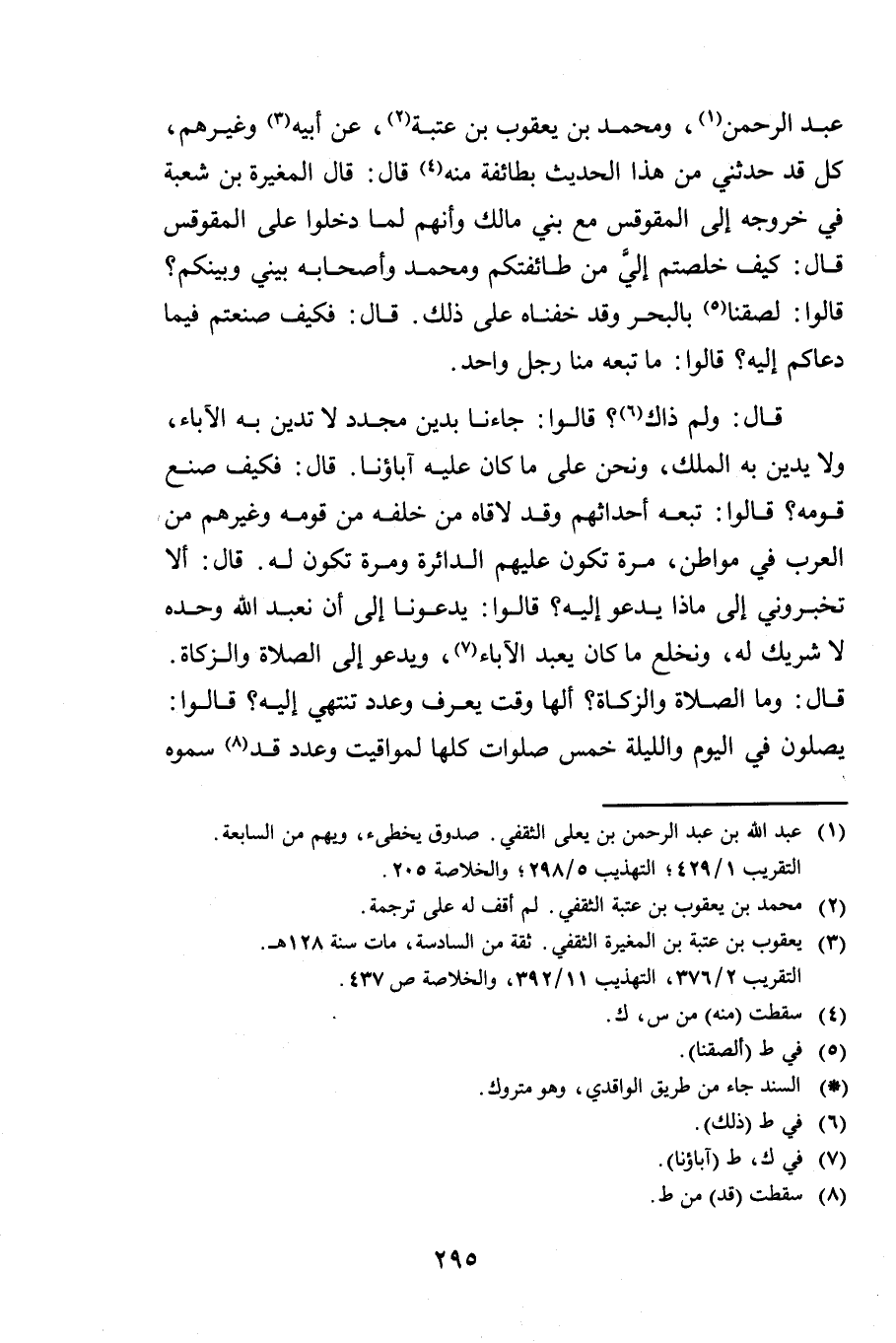 عَبْدِ الرَّحْمَنِ وَمُحَمَّدُ بْنُ يَعْقُوبَ بْنِ عُتْبَةَ، عَنْ أَبِيهِ وَغَيْرِهِمْ، كُلٌّ قَدْ حَدَّثَنِي مِنْ هَذَا الْحَدِيثِ بِطَائِفَةٍ مِنْهُ، قَالَ: قَالَ الْمُغِيرَةُ بْنُ شُعْبَةَ فِي خُرُوجِهِ إِلَى الْمُقَوْقِسِ مَعَ بَنِي مَالِكٍ، وَأَنَّهُمْ لَمَّا دَخَلُوا عَلَى الْمُقَوْقِسِ، قَالَ: كَيْفَ خَلَصْتُمْ إِلَيَّ مِنْ طَائِفَتِكُمْ وَمُحَمَّدٌ وَأَصْحَابُهُ بَيْنِي وَبَيْنَكُمْ؟ قَالُوا: لَصِقْنَا بِالْبَحْرِ وَقَدْ خِفْنَاهُ عَلَى ذَلِكَ. قَالَ: فَكَيْفَ صَنَعْتُمْ فِيمَا دَعَاكُمْ إِلَيْهِ؟ قَالُوا: مَا تَبِعَهُ مِنَّا رَجُلٌ وَاحِدٌ. قَالَ: وَلِمَ ذَاكَ؟ قَالُوا: جَاءَنَا بِدِينٍ مُجَدَّدٍ لَا تَدِينُ بِهِ الْآبَاءُ وَلَا يَدِينُ بِهِ الْمَلِكُ، وَنَحْنُ عَلَى مَا كَانَ عَلَيْهِ آبَاؤُنَا. قَالَ: فَكَيْفَ صَنَعَ قَوْمُهُ؟ قَالُوا: تَبِعَهُ أَحْدَاثُهُمْ، وَقَدْ لَاقَاهُ مَنْ خَلْفَهُ مِنْ قَوْمِهِ وَغَيْرِهِمْ مِنَ الْعَرَبِ فِي مُوَاطِنَ مَرَّةً تَكُونُ عَلَيْهِمُ الدَّائِرَةُ وَمَرَّةً تَكُونُ لَهُ. قَالَ: أَلَا تُخْبِرُونِي إِلَى مَاذَا يَدْعُو إِلَيْهِ؟ قَالُوا: يَدْعُونَا إِلَى أَنْ نَعْبُدَ اللَّهَ وَحْدَهُ لَا شَرِيكَ لَهُ، وَنَخْلَعَ مَا كَانَ يَعْبُدُ الْآبَاءُ، وَيَدْعُو إِلَى الصَّلَاةِ وَالزَّكَاةِ. قَالَ: وَمَا الصَّلَاةُ وَالزَّكَاةُ أَلَهَا وَقْتٌ يُعْرَفُ وَعَدَدٌ تَنْتَهِي إِلَيْهِ؟ قَالُوا: يُصَلُّونَ فِي الْيَوْمِ وَاللَّيْلَةِ خَمْسَ صَلَوَاتٍ كُلُّهَا لِمَوَاقِيتَ وَعَدَدٍ قَدْ سَمَّوْهُ