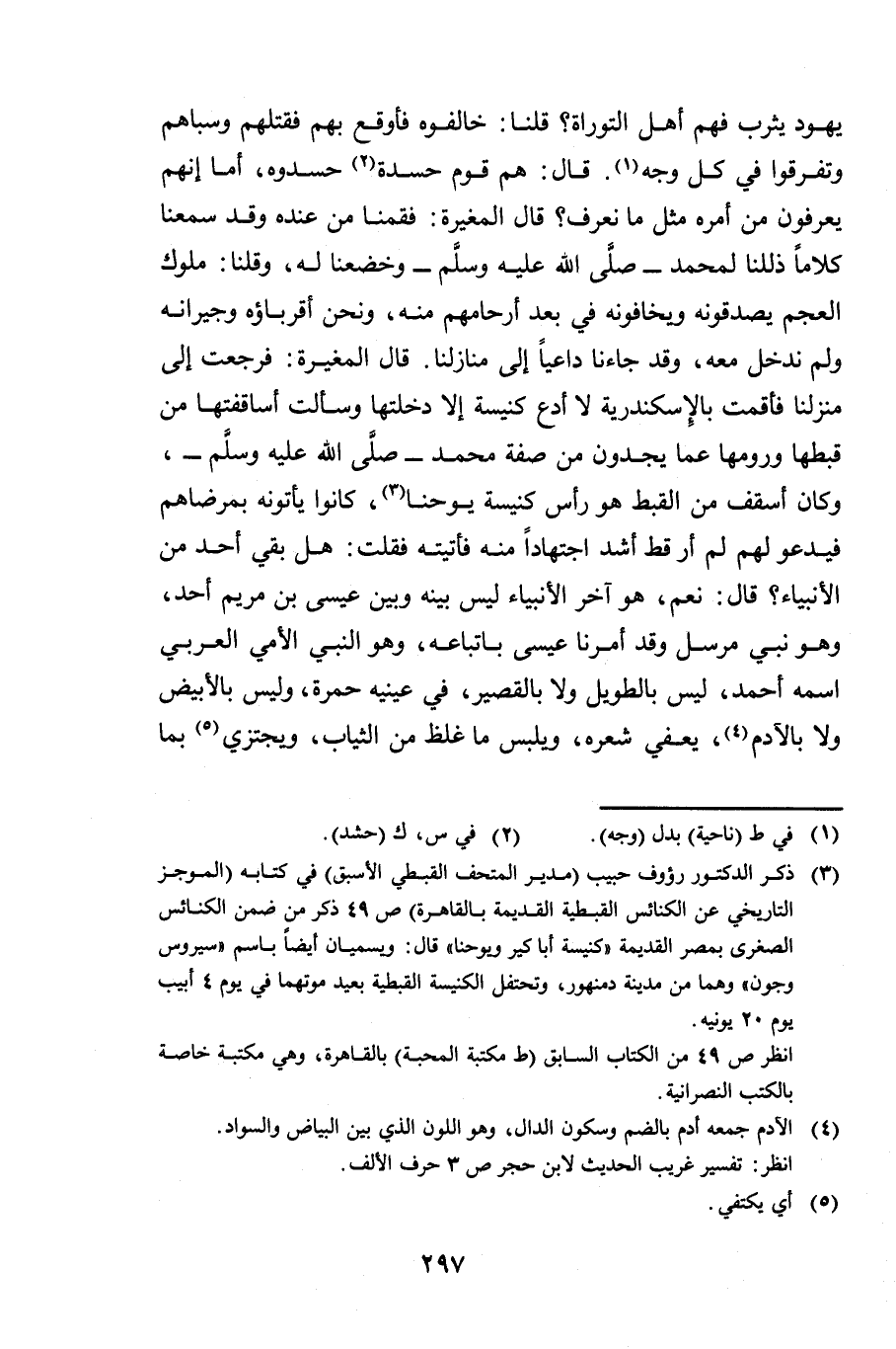 يَهُودُ يَثْرِبَ فَهُمْ أَهْلُ التَّوْرَاةِ؟ قُلْنَا: خَالَفُوهُ، فَأَوْقَعَ بِهِمْ فَقَتَلَهُمْ وَسَبَاهُمْ وَتَفَرَّقُوا فِي كُلِّ وَجْهٍ. قَالَ: هُمْ قَوْمٌ حَسَدَةٌ حَسَدُوهُ، أَمَا إِنَّهُمْ يَعْرِفُونَ مِنْ أَمْرِهِ مِثْلَ مَا نَعْرِفُ؟ قَالَ الْمُغِيرَةُ: فَقُمْنَا مِنْ عِنْدِهِ، وَقَدْ سَمِعْنَا كَلَامًا ذَلَّلَنَا لِمُحَمَّدٍ صَلَّى اللَّهُ عَلَيْهِ وَسَلَّمَ وَخَضَّعَنَا لَهُ، وَقُلْنَا: مُلُوكُ الْعَجَمِ يُصَدِّقُونَهُ وَيَخَافُونَهُ فِي بُعْدِ أَرْحَامِهِمْ مِنْهُ، وَنَحْنُ أَقْرِبَاؤُهُ وَجِيرَانُهُ وَلَمْ نَدْخُلْ مَعَهُ وَقَدْ جَاءَنَا دَاعِيًا إِلَى مَنَازِلِنَا، قَالَ الْمُغِيرَةُ: فَرَجَعْتُ إِلَى مَنْزِلِنَا فَأَقَمْتُ بِالْإِسْكَنْدَرِيَّةِ لَا أَدَعُ كَنِيسَةً إِلَّا دَخَلْتُهَا، وَسَأَلْتُ أَسَاقِفَتَهَا مِنْ قِبْطِهَا وَرُومِهَا عَمَّا يَجِدُونَ مِنْ صِفَةِ مُحَمَّدٍ صَلَّى اللَّهُ عَلَيْهِ وَسَلَّمَ وَكَانَ أُسْقُفٌّ مِنَ الْقِبْطِ هُوَ رَأْسُ كَنِيسَةِ يُوحَنَّا كَانُوا يَأْتُونَهُ بِمَرْضَاهُمْ فَيَدْعُو لَهُمْ لَمْ أَرَ قَطُّ أَشَدَّ اجْتِهَادًا مِنْهُ، فَأَتَيْتُهُ فَقُلْتُ: هَلْ بَقِيَ أَحَدٌ مِنَ الْأَنْبِيَاءِ؟ قَالَ: نَعَمْ، هُوَ آخِرُ الْأَنْبِيَاءِ لَيْسَ بَيْنَهُ وَبَيْنَ عِيسَى ابْنِ مَرْيَمَ أَحَدٌ، وَهُوَ نَبِيٌّ مُرْسَلٌ وَقَدْ أَمَرَنَا عِيسَى بِاتِّبَاعِهِ، وَهُوَ النَّبِيُّ الْأُمِّيُّ الْعَرَبِيُّ اسْمُهُ أَحْمَدُ، لَيْسَ بِالطَّوِيلِ وَلَا بِالْقَصِيرِ، فِي عَيْنَيْهِ حُمْرَةٌ، وَلَيْسَ بِالْأَبْيَضِ وَلَا بِالْآدَمِ، يُعْفِي شَعْرَهُ وَيَلْبَسُ مَا غَلُظَ مِنَ الثِّيَابِ وَيَجْتَزِي بِمَا