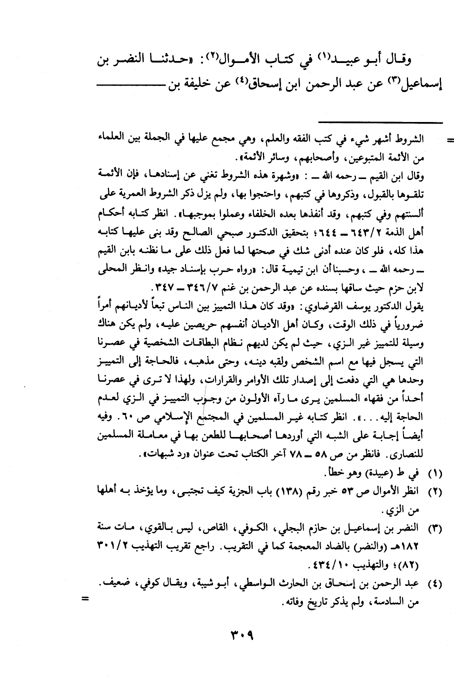 وَقَالَ أَبُو عُبَيْدٍ فِي كِتَابِ الْأَمْوَالِ: حَدَّثَنَا النَّضْرُ بْنُ إِسْمَاعِيلَ، عَنْ عَبْدِ الرَّحْمَنِ بْنِ إِسْحَاقَ، عَنْ خَلِيفَةَ بْنِ