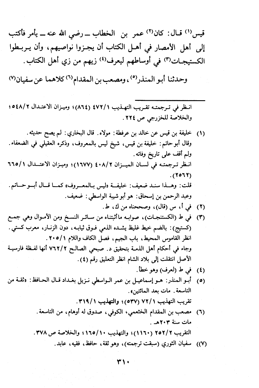 قَيْسٍ، قَالَ: كَانَ عُمَرُ بْنُ الْخَطَّابِ رَضِيَ اللَّهُ عَنْهُ يَأْمُرُ فَأَكْتُبُ إِلَى أَهْلِ الْأَمْصَارِ فِي أَهْلِ الْكِتَابِ: أَنْ يَجُزُّوا نَوَاصِيَهُمْ، وَأَنْ يَرْبِطُوا الْكُسْتِيجَاتِ فِي أَوْسَاطِهِمْ ; لِيُعْرَفَ زِيُّهُمْ مِنْ زِيِّ أَهْلِ الْكِتَابِ.