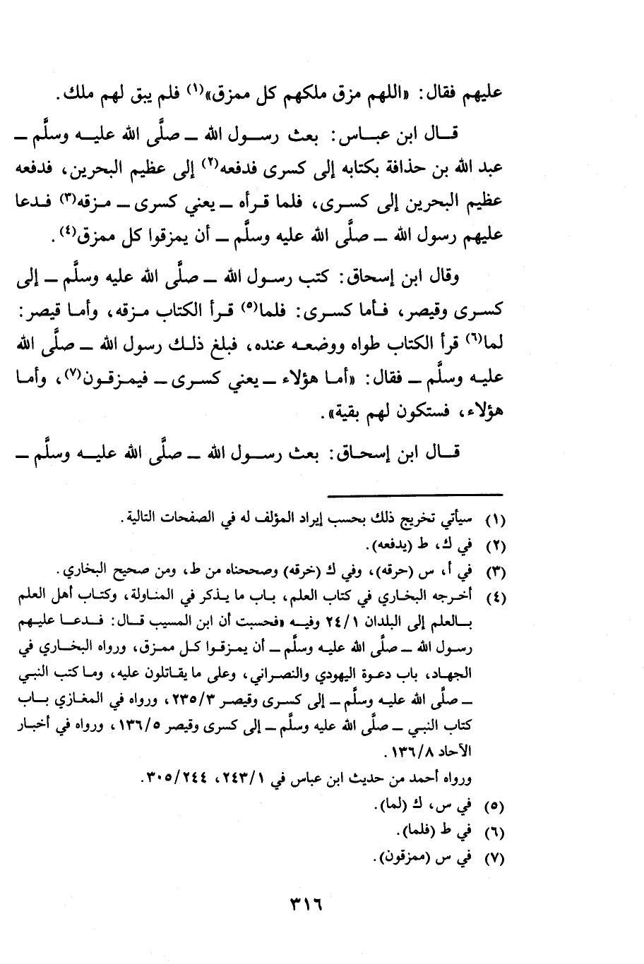 قَالَ ابْنُ عَبَّاسٍ: «بَعَثَ رَسُولُ اللَّهِ صَلَّى اللَّهُ عَلَيْهِ وَسَلَّمَ عَبْدَ اللَّهِ بْنَ حُذَافَةَ بِكِتَابِهِ إِلَى كِسْرَى، فَدَفَعَهُ إِلَى عَظِيمِ الْبَحْرَيْنِ، فَدَفَعَهُ عَظِيمُ الْبَحْرَيْنِ إِلَى كِسْرَى، فَلَمَّا قَرَأَهُ يَعْنِي كِسْرَى مَزَّقَهُ، فَدَعَا عَلَيْهِمْ رَسُولُ اللَّهِ صَلَّى اللَّهُ عَلَيْهِ وَسَلَّمَ أَنْ يُمَزَّقُوا كُلَّ مُمَزَّقٍ» .