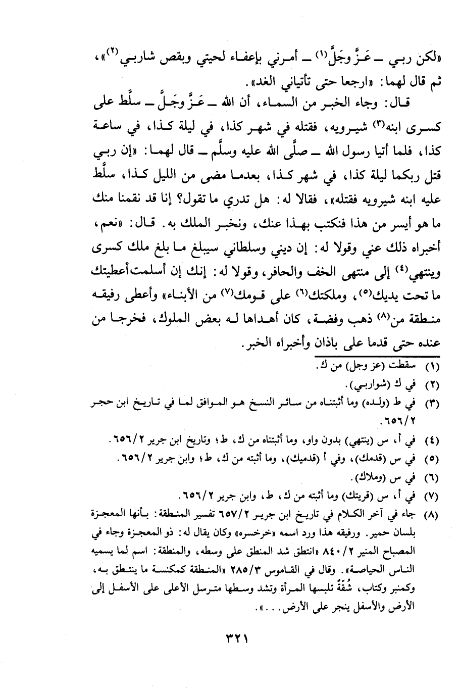 قَالَ: وَجَاءَ الْخَبَرُ مِنَ السَّمَاءِ: أَنَّ اللَّهَ عَزَّ وَجَلَّ سَلَّطَ عَلَى كِسْرَى ابْنَهُ شِيرَوَيْهِ، فَقَتَلَهُ فِي شَهْرِ كَذَا، فِي لَيْلَةِ كَذَا، فِي سَاعَةِ كَذَا، فَلَمَّا أَتَيَا رَسُولَ اللَّهِ صَلَّى اللَّهُ عَلَيْهِ وَسَلَّمَ، قَالَ لَهُمَا: «إِنَّ رَبِّي قَتَلَ رَبَّكُمَا لَيْلَةَ كَذَا، فِي شَهْرِ كَذَا، بَعْدَمَا مَضَى مِنَ اللَّيْلِ كَذَا، سَلَّطَ عَلَيْهِ ابْنَهُ شِيرَوَيْهِ فَقَتَلَهُ» ، فَقَالَا لَهُ: هَلْ تَدْرِي مَا تَقُولُ؟ إِنَّا قَدْ نَقَمْنَا مِنْكَ مَا هُوَ أَيْسَرُ مِنْ هَذَا فَنَكْتُبُ بِهَذَا عَنْكَ وَنُخْبِرُ الْمَلِكَ بِهِ؟ قَالَ: «نَعَمْ أَخْبِرَاهُ ذَلِكَ عَنِّي، وَقُولَا لَهُ إِنَّ دِينِي وَسُلْطَانِي سَيَبْلُغُ مَا بَلَغَ مُلْكُ كِسْرَى، وَيَنْتَهِي إِلَى مُنْتَهَى الْخُفِّ وَالْحَافِرِ، وَقُولَا لَهُ: إِنَّكَ إِنْ أَسْلَمْتَ أَعْطَيْتُكَ مَا تَحْتَ يَدَيْكَ وَمَلَّكْتُكَ عَلَى قَوْمِكَ مِنَ الْأَبْنَاءِ» . وَأَعْطَى رَفِيقَهُ مِنْطَقَةً مِنْ ذَهَبٍ وَفِضَّةٍ كَانَ أَهْدَاهَا لَهُ بَعْضُ الْمُلُوكِ، فَخَرَجَا مِنْ عِنْدِهِ حَتَّى قَدِمَا عَلَى بَاذَانَ وَأَخْبَرَاهُ الْخَبَرَ.