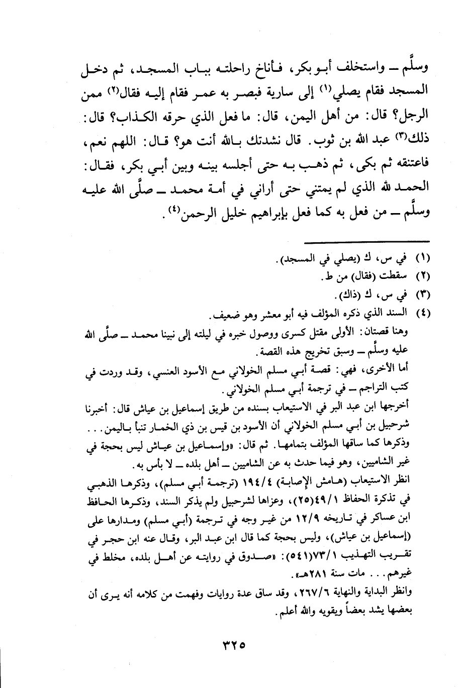 وَسَلَّمَ، وَاسْتُخْلِفَ أَبُو بَكْرٍ، فَأَنَاخَ رَاحِلَتَهُ بِبَابِ الْمَسْجِدِ، ثُمَّ دَخَلَ الْمَسْجِدَ فَقَامَ يُصَلِّي إِلَى سَارِيَةٍ، فَبَصُرَ بِهِ عُمَرُ، فَقَامَ إِلَيْهِ فَقَالَ: مِمَّنِ الرَّجُلُ؟ قَالَ: مِنْ أَهْلِ الْيَمَنِ. قَالَ: مَا فَعَلَ الَّذِي حَرَقَهُ الْكَذَّابُ؟ قَالَ: ذَلِكَ عَبْدُ اللَّهِ بْنُ ثَوْبٍ. قَالَ: نَشَدْتُكَ بِاللَّهِ أَنْتَ هُوَ؟ قَالَ: اللَّهُمَّ نَعَمْ. فَاعْتَنَقَهُ، ثُمَّ بَكَى، ثُمَّ ذَهَبَ بِهِ حَتَّى أَجْلَسَهُ بَيْنَهُ وَبَيْنَ أَبِي بَكْرٍ، فَقَالَ: الْحَمْدُ لِلَّهِ الَّذِي لَمْ يُمِتْنِي حَتَّى أَرَانِي فِي أُمَّةِ مُحَمَّدٍ صَلَّى اللَّهُ عَلَيْهِ وَسَلَّمَ مَنْ فَعَلَ بِهِ كَمَا فَعَلَ بِإِبْرَاهِيمَ خَلِيلِ الرَّحْمَنِ.
