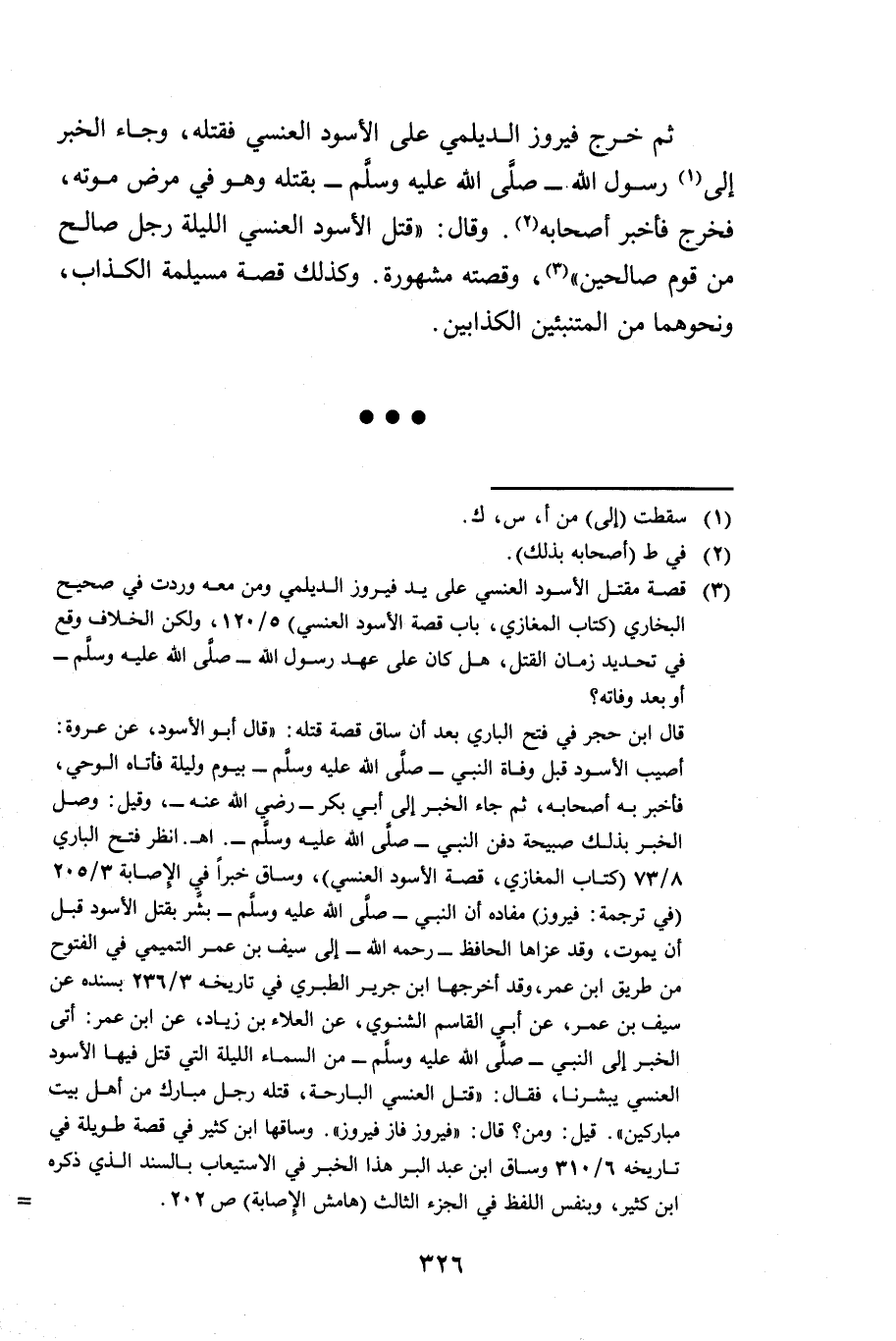 ثُمَّ خَرَجَ فَيْرُوزُ الدَّيْلَمِيُّ عَلَى الْأَسْوَدِ الْعَنْسِي فَقَتَلَهُ، وَجَاءَ الْخَبَرُ إِلَى رَسُولِ اللَّهِ صَلَّى اللَّهُ عَلَيْهِ وَسَلَّمَ بِقَتْلِهِ وَهُوَ فِي مَرَضِ مَوْتِهِ، فَخَرَجَ فَأَخْبَرَ أَصْحَابَهُ. وَقَالَ: «قَتَلَ الْأَسْوَدَ الْعَنْسِيَّ اللَّيْلَةَ رَجُلٌ صَالِحٌ مِنْ قَوْمٍ صَالِحِينَ» . وَقِصَّتُهُ مَشْهُورَةٌ، وَكَذَلِكَ قِصَّةُ مُسَيْلِمَةَ الْكَذَّابِ وَنَحْوِهِمَا مِنَ الْمُتَنَبِّئِينَ الْكَذَّابِينَ.