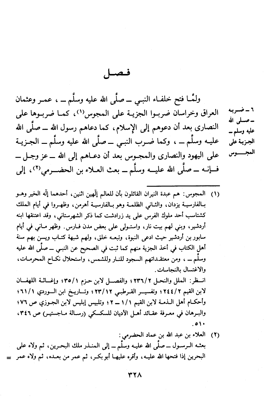 وَلَمَّا فَتَحَ خُلَفَاءُ النَّبِيِّ صَلَّى اللَّهُ عَلَيْهِ وَسَلَّمَ عُمَرُ وَعُثْمَانُ الْعِرَاقَ وَخُرَاسَانَ ضَرَبُوا الْجِزْيَةَ عَلَى الْمَجُوسِ، كَمَا ضَرَبُوهَا عَلَى النَّصَارَى بَعْدَ أَنْ دَعَوْهُمْ إِلَى الْإِسْلَامِ، كَمَا دَعَاهُمْ رَسُولُ اللَّهِ صَلَّى اللَّهُ عَلَيْهِ وَسَلَّمَ، وَكَمَا ضَرَبَ النَّبِيُّ صَلَّى اللَّهُ عَلَيْهِ وَسَلَّمَ الْجِزْيَةَ عَلَى الْيَهُودِ وَالنَّصَارَى وَالْمَجُوسِ بَعْدَ أَنْ دَعَاهُمْ إِلَى اللَّهِ عَزَّ وَجَلَّ، فَإِنَّهُ صَلَّى اللَّهُ عَلَيْهِ وَسَلَّمَ بَعَثَ الْعَلَاءَ بْنَ الْحَضْرَمِيِّ إِلَى