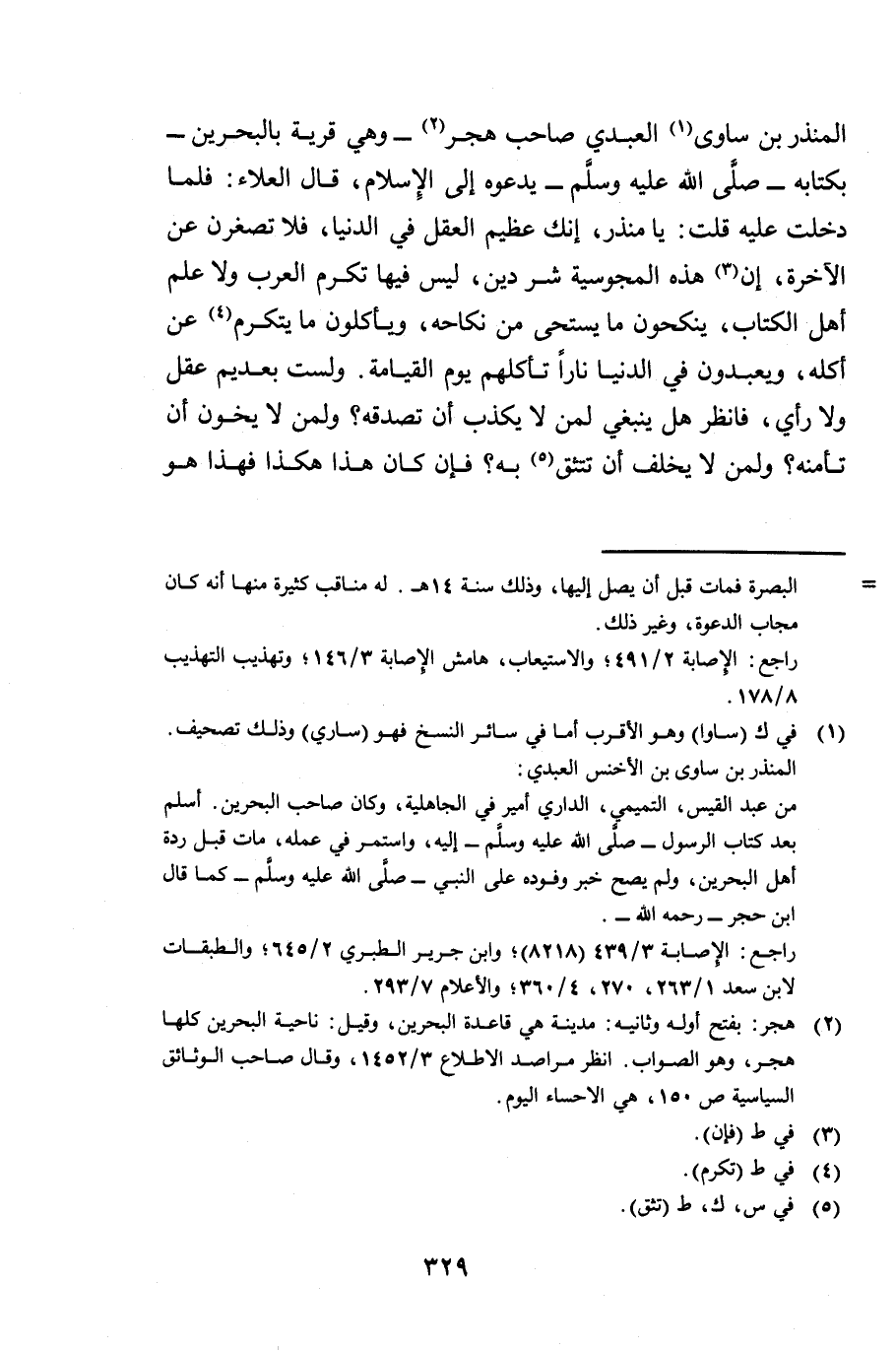 الْمُنْذِرِ بْنِ سَاوَى الْعَبْدِيِّ صَاحِبِ هَجَرَ - وَهِيَ قَرْيَةٌ بِالْبَحْرَيْنِ - بِكِتَابِهِ صَلَّى اللَّهُ عَلَيْهِ وَسَلَّمَ يَدْعُوهُ إِلَى الْإِسْلَامِ، قَالَ الْعَلَاءُ: فَلَمَّا دَخَلْتُ عَلَيْهِ قُلْتُ: يَا مُنْذِرُ، إِنَّكَ عَظِيمُ الْعَقْلِ فِي الدُّنْيَا، فَلَا تَصْغُرَنَّ عَنِ الْآخِرَةِ، إِنَّ هَذِهِ الْمَجُوسِيَّةَ شَرُّ دِينٍ، لَيْسَ فِيهَا تَكَرُّمُ الْعَرَبِ، وَلَا عِلْمُ أَهْلِ الْكِتَابِ، يَنْكِحُونَ مَا يُسْتَحَى مِنْ نِكَاحِهِ، وَيَأْكُلُونَ مَا يُتَكَرَّمُ عَنْ أَكْلِهِ، وَيَعْبُدُونَ فِي الدُّنْيَا نَارًا تَأْكُلُهُمْ يَوْمَ الْقِيَامَةِ، وَلَسْتَ بِعَدِيمِ عَقْلٍ وَلَا رَأْيٍ، فَانْظُرْ هَلْ يَنْبَغِي لِمَنْ لَا يَكْذِبُ أَنْ تُصَدِّقَهُ، وَلِمَنْ لَا يَخُونُ أَنْ تَأْمَنَهُ، وَلِمَنْ لَا يُخْلِفُ أَنْ تَتَّثِقَ بِهِ، فَإِنْ كَانَ هَذَا هَكَذَا فَهَذَا هُوَ