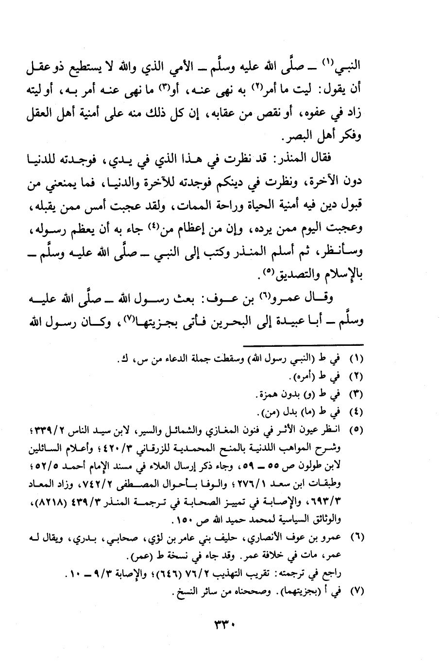 فَقَالَ الْمُنْذِرُ: قَدْ نَظَرْتُ فِي هَذَا الَّذِي فِي يَدَيَّ فَوَجَدْتُهُ لِلدُّنْيَا دُونَ الْآخِرَةِ، وَنَظَرْتُ فِي دِينِكُمْ فَوَجَدْتُهُ لِلْآخِرَةِ وَالدُّنْيَا، فَمَا يَمْنَعُنِي مِنْ قَبُولِ دِينٍ فِيهِ أُمْنِيَةُ الْحَيَاةِ وَرَاحَةُ الْمَمَاتِ، وَلَقَدْ عَجِبْتُ أَمْسِ مِمَّنْ يَقْبَلُهُ، وَعَجِبْتُ الْيَوْمَ مِمَّنْ يَرُدُّهُ، وَإِنَّ مِنْ إِعْظَامِ مَنْ جَاءَ بِهِ أَنْ يُعَظِّمَ رَسُولَهُ، وَسَأَنْظُرُ، ثُمَّ أَسْلَمَ الْمُنْذِرُ، وَكَتَبَ إِلَى النَّبِيِّ صَلَّى اللَّهُ عَلَيْهِ وَسَلَّمَ بِالْإِسْلَامِ وَالتَّصْدِيقِ.