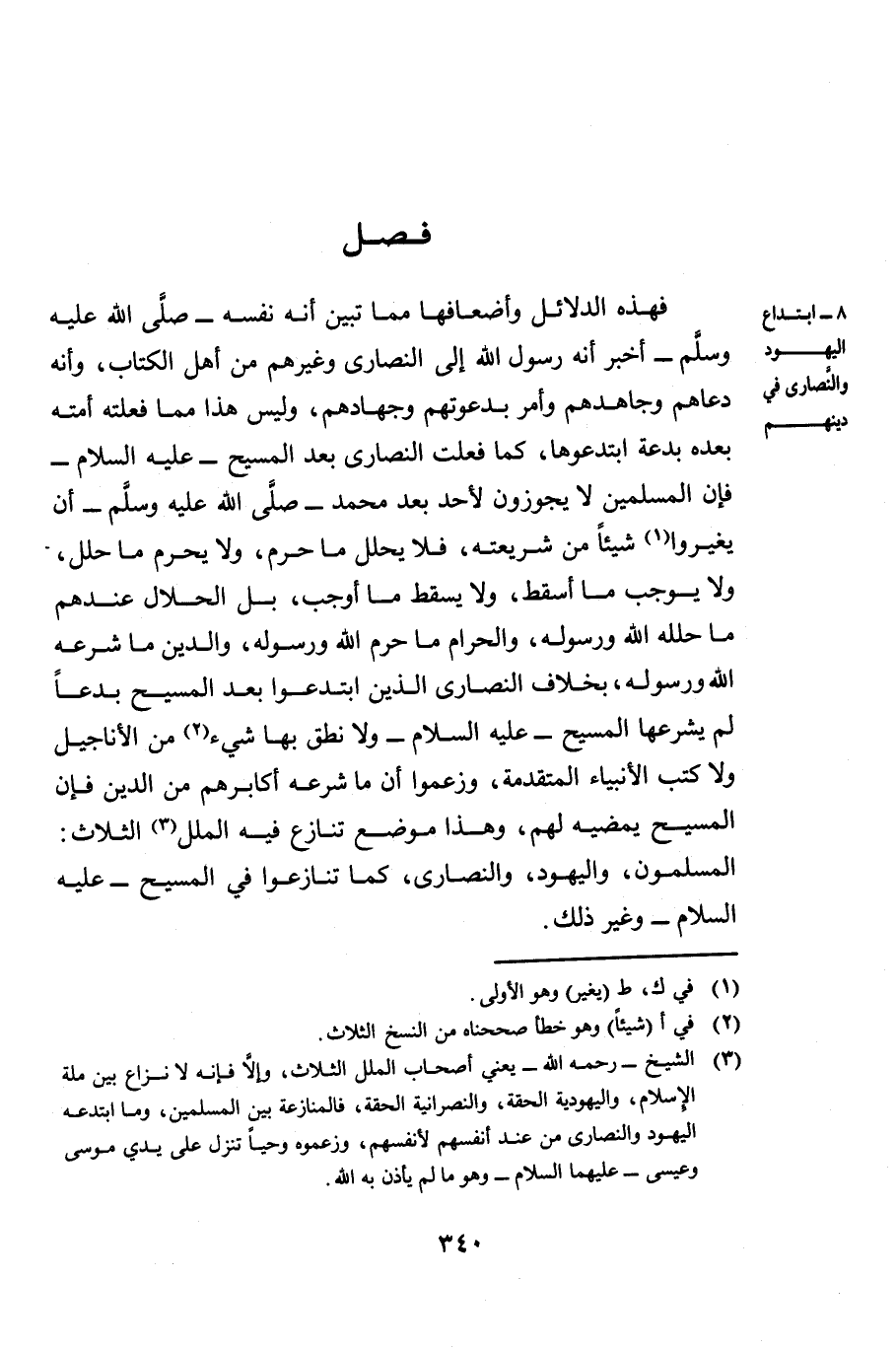 فَهَذِهِ الدَّلَائِلُ وَأَضْعَافُهَا مِمَّا تَبَيَّنَ أَنَّهُ نَفْسَهُ صَلَّى اللَّهُ عَلَيْهِ وَسَلَّمَ أَخْبَرَ أَنَّهُ رَسُولُ اللَّهِ إِلَى النَّصَارَى وَغَيْرِهِمْ مِنْ أَهْلِ الْكِتَابِ، وَأَنَّهُ دَعَاهُمْ وَجَاهَدَهُمْ وَأَمَرَ بِدَعْوَتِهِمْ وَجِهَادِهِمْ، وَلَيْسَ هَذَا مِمَّا فَعَلَتْهُ أُمَّتُهُ بَعْدَهُ بِدْعَةً ابْتَدَعُوهَا، كَمَا فَعَلَتِ النَّصَارَى بَعْدَ الْمَسِيحِ عَلَيْهِ السَّلَامُ، فَإِنَّ الْمُسْلِمِينَ لَا يُجَوِّزُونَ لِأَحَدٍ بَعْدَ مُحَمَّدٍ صَلَّى اللَّهُ عَلَيْهِ وَسَلَّمَ أَنْ يُغَيِّرُوا شَيْئًا مِنْ شَرِيعَتِهِ، فَلَا يُحَلِّلُ مَا حَرَّمَ وَلَا يُحَرِّمُ مَا حَلَّلَ، وَلَا يُوجِبُ مَا أَسْقَطَ وَلَا يُسْقِطُ مَا أَوْجَبَ، بَلِ الْحَلَالُ عِنْدَهُمْ مَا حَلَّلَهُ اللَّهُ وَرَسُولُهُ، وَالْحَرَامُ مَا حَرَّمَ اللَّهُ وَرَسُولُهُ، وَالدِّينُ مَا شَرَعَهُ اللَّهُ وَرَسُولُهُ، بِخِلَافِ النَّصَارَى الَّذِينَ ابْتَدَعُوا بَعْدَ الْمَسِيحِ بِدَعًا لَمْ يُشَرِّعْهَا الْمَسِيحُ عَلَيْهِ السَّلَامُ، وَلَا نَطَقَ بِهَا شَيْءٌ مِنَ الْأَنَاجِيلِ وَلَا كُتُبُ الْأَنْبِيَاءِ الْمُتَقَدِّمَةِ وَزَعَمُوا أَنَّ مَا شَرَعَهُ أَكَابِرُهُمْ مِنَ الدِّينِ فَإِنَّ الْمَسِيحَ يُمْضِيهِ لَهُمْ، وَهَذَا مَوْضِعٌ تَنَازَعَ فِيهِ الْمِلَلُ الثَّلَاثُ الْمُسْلِمُونَ وَالْيَهُودُ وَالنَّصَارَى، كَمَا تَنَازَعُوا فِي الْمَسِيحِ عَلَيْهِ السَّلَامُ وَغَيْرِ ذَلِكَ.