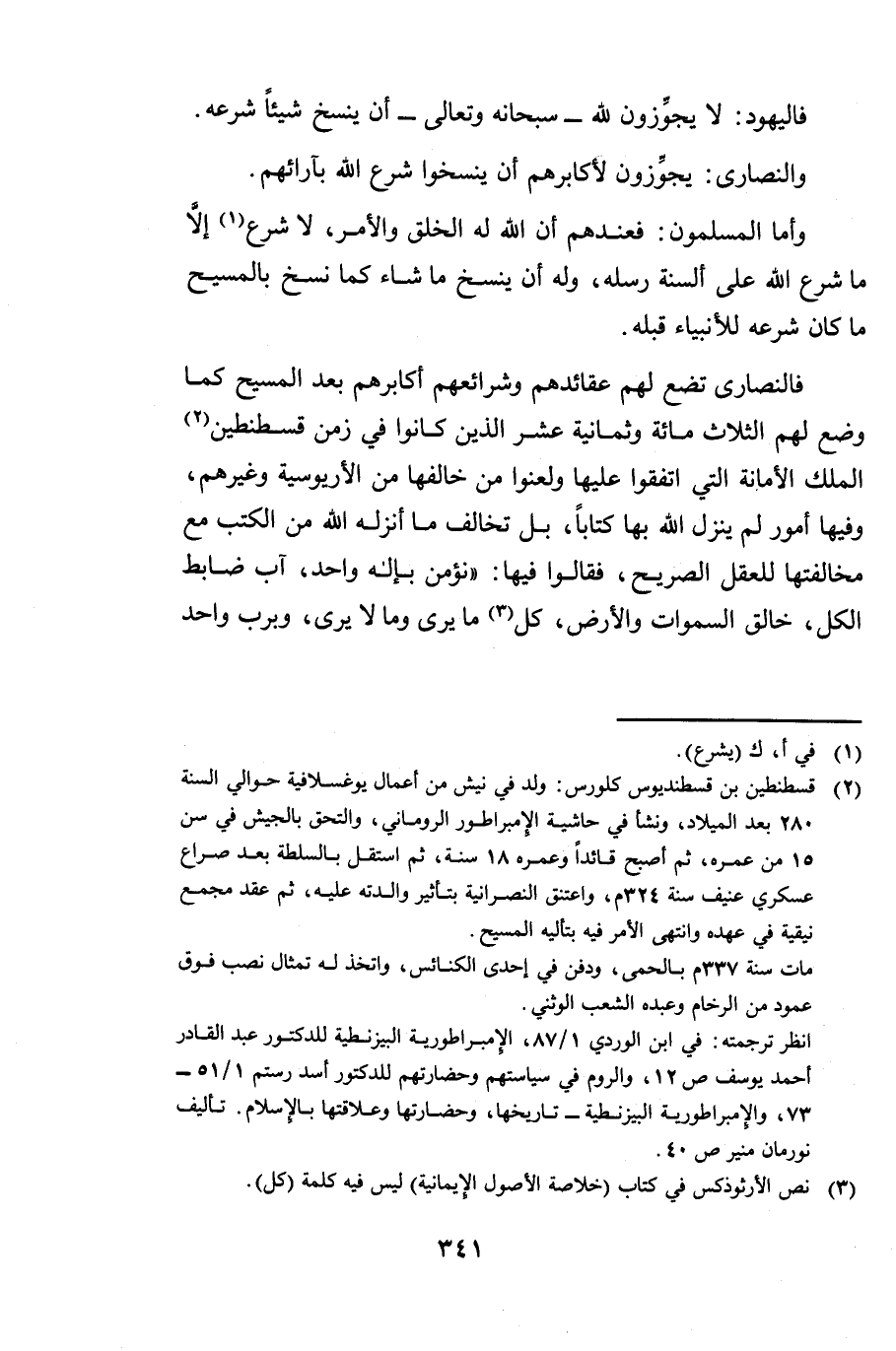فَالنَّصَارَى تَضَعُ لَهُمْ عَقَائِدَهُمْ وَشَرَائِعَهُمْ أَكَابِرُهُمْ بَعْدَ الْمَسِيحِ، كَمَا وَضَعَ لَهُمُ الثَّلَاثُمِائَةٍ وَثَمَانِيَةَ عَشَرَ الَّذِينَ كَانُوا فِي زَمَنِ قُسْطَنْطِينَ الْمَلِكِ الْأَمَانَةَ الَّتِي اتَّفَقُوا عَلَيْهَا، وَلَعَنُوا مَنْ خَالَفَهَا مِنَ الْأَرْيُوسِيَّةِ وَغَيْرِهِمْ، وَفِيهَا أُمُورٌ لَمْ يُنْزِلِ اللَّهُ بِهَا كِتَابًا، بَلْ تُخَالِفُ مَا أَنْزَلَهُ اللَّهُ مِنَ الْكُتُبِ مَعَ مُخَالَفَتِهَا لِلْعَقْلِ الصَّرِيحِ فَقَالُوا فِيهَا: نُؤْمِنُ بِإِلَهٍ وَاحِدٍ، أَبٍ ضَابِطِ الْكُلِّ، خَالِقِ السَّمَاوَاتِ وَالْأَرْضِ، كُلِّ مَا يُرَى وَمَا لَا يُرَى، وَبِرَبٍّ وَاحِدٍ