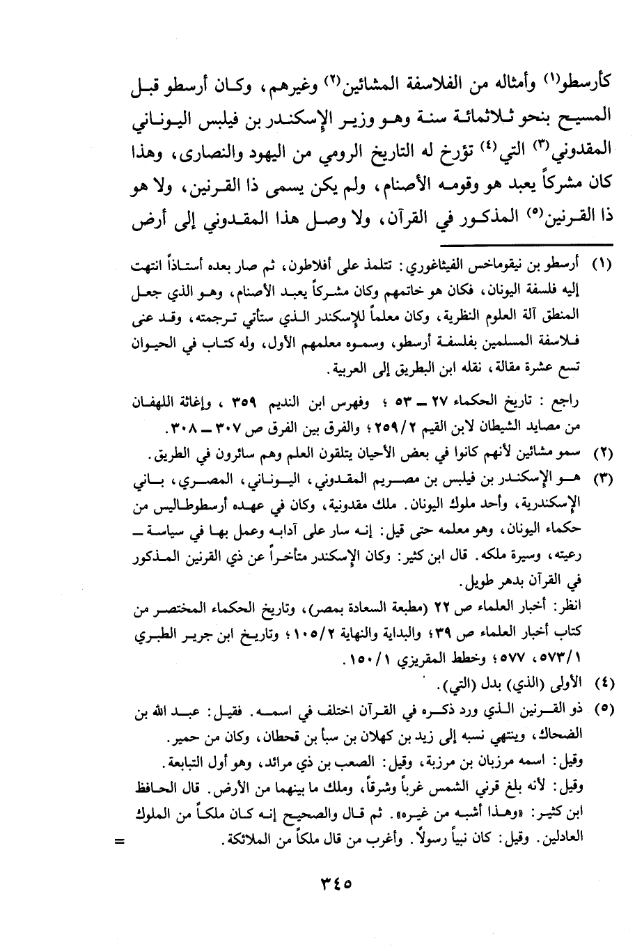 كَأَرِسْطُو وَأَمْثَالِهِ مِنَ الْفَلَاسِفَةِ الْمَشَّائِينَ وَغَيْرِهِمْ، وَكَانَ أَرِسْطُو قَبْلَ الْمَسِيحِ بِنَحْوِ ثَلَاثِمِائَةِ سَنَةٍ، وَهُوَ وَزِيرُ الْإِسْكَنْدَرِ بْنِ فِيلِبْسَ الْيُونَانِيِّ الْمَقْدُونِيِّ الَّتِي تُؤَرَّخُ لَهُ التَّارِيخُ الرُّومِيُّ مِنَ الْيَهُودِ وَالنَّصَارَى، وَهَذَا كَانَ مُشْرِكًا يَعْبُدُ هُوَ وَقَوْمُهُ الْأَصْنَامَ، وَلَمْ يَكُنْ يُسَمَّى ذَا الْقَرْنَيْنِ، وَلَا هُوَ ذَا الْقَرْنَيْنِ الْمَذْكُورُ فِي الْقُرْآنِ، وَلَا وَصَلَ هَذَا الْمَقْدُونِيُّ إِلَى أَرْضِ