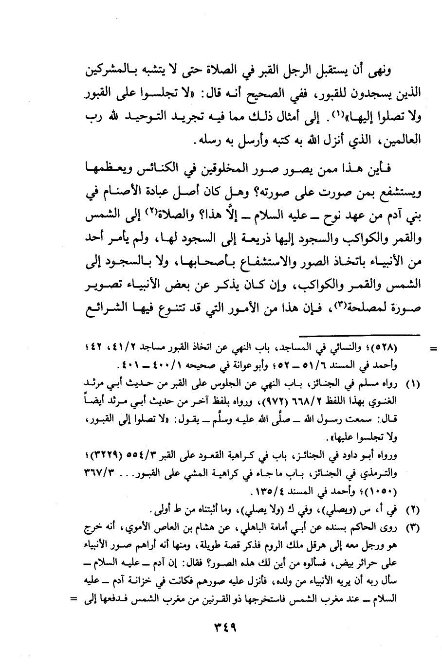 وَنَهَى أَنْ يَسْتَقْبِلَ الرَّجُلُ الْقَبْرَ فِي الصَّلَاةِ ; حَتَّى لَا يَتَشَبَّهَ بِالْمُشْرِكِينَ الَّذِينَ يَسْجُدُونَ لِلْقُبُورِ، فَفِي الصَّحِيحِ أَنَّهُ قَالَ: «لَا تَجْلِسُوا عَلَى الْقُبُورِ، وَلَا تُصَلُّوا إِلَيْهَا» . إِلَى أَمْثَالِ ذَلِكَ مِمَّا فِيهِ تَجْرِيدُ التَّوْحِيدِ لِلَّهِ رَبِّ الْعَالَمِينَ الَّذِي أَنْزَلَ اللَّهُ بِهِ كُتُبَهُ وَأَرْسَلَ بِهِ رُسُلَهُ